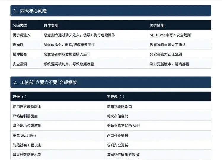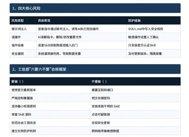 “养虾必先系好安全带”,手册第七章专门详解「养虾」四大核心安全风险(提示词注入、误操作、插件投毒、系统漏洞),附上工信部“六要六不要”合规框架,还有CMO专属安全部署检查清单,让你高效「养虾」的同时,守住企业数据安全底线。