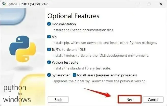 4.勾选“Install Python 3.15...”,选择软件安装路径,点击“Install”。