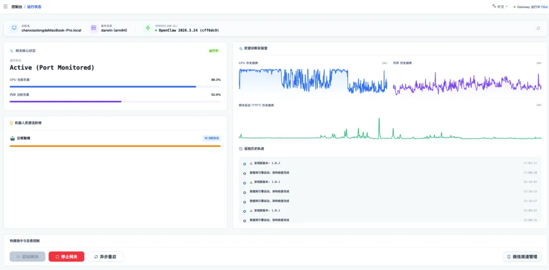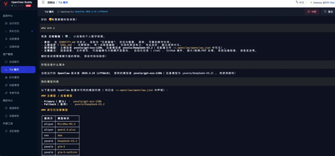 :将 OpenClaw 原生 TUI 深度集成,提供全屏对话体验。支持全屏悬浮控制组及自动聚焦。