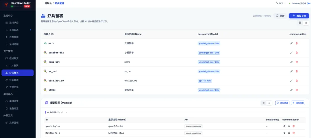 :支持在创建时动态选择模型,自动化生成 Bot 独立的 workspace 与环境配置。