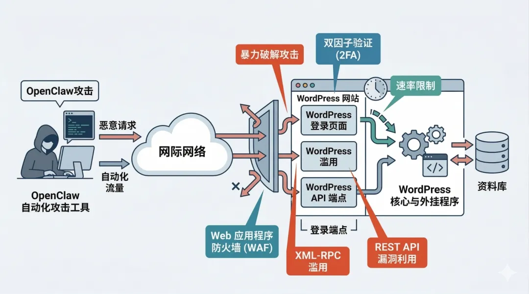 3. 速率限制(Rate Limiting): 在 WAF(如 Cloudflare)层级对 wp-login.php 和 API 写入端点加限速,切断自动化爆破的生路。