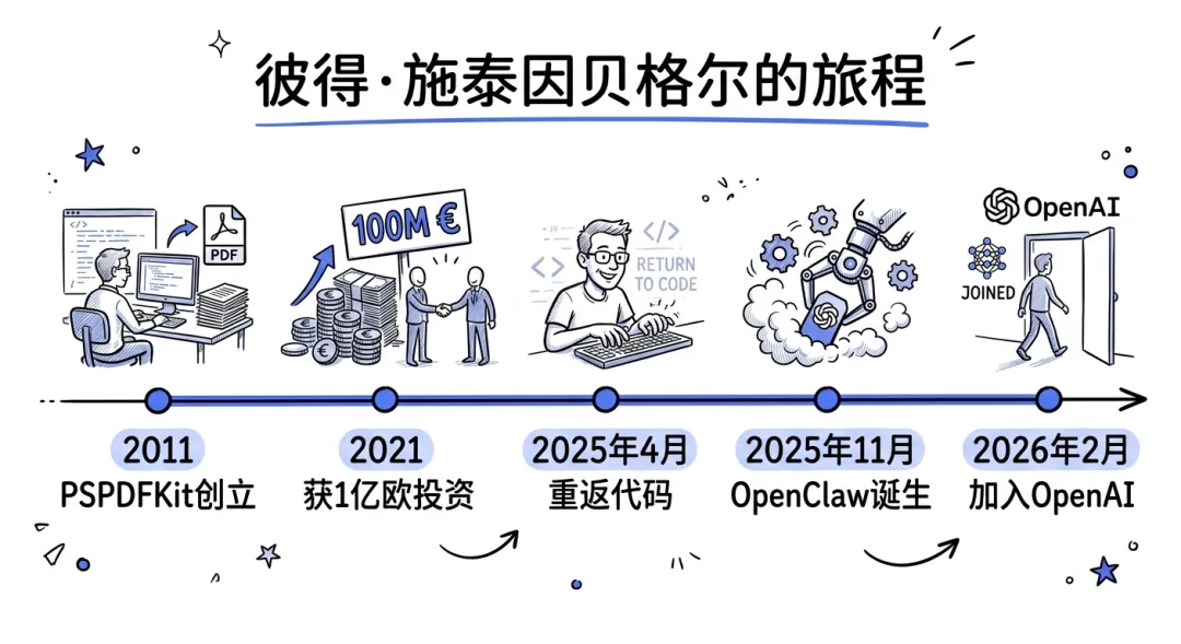 img01:Peter Steinberger 的创业时间线,从2011年PSPDFKit到2025年重返代码到2025年11月OpenClaw诞生