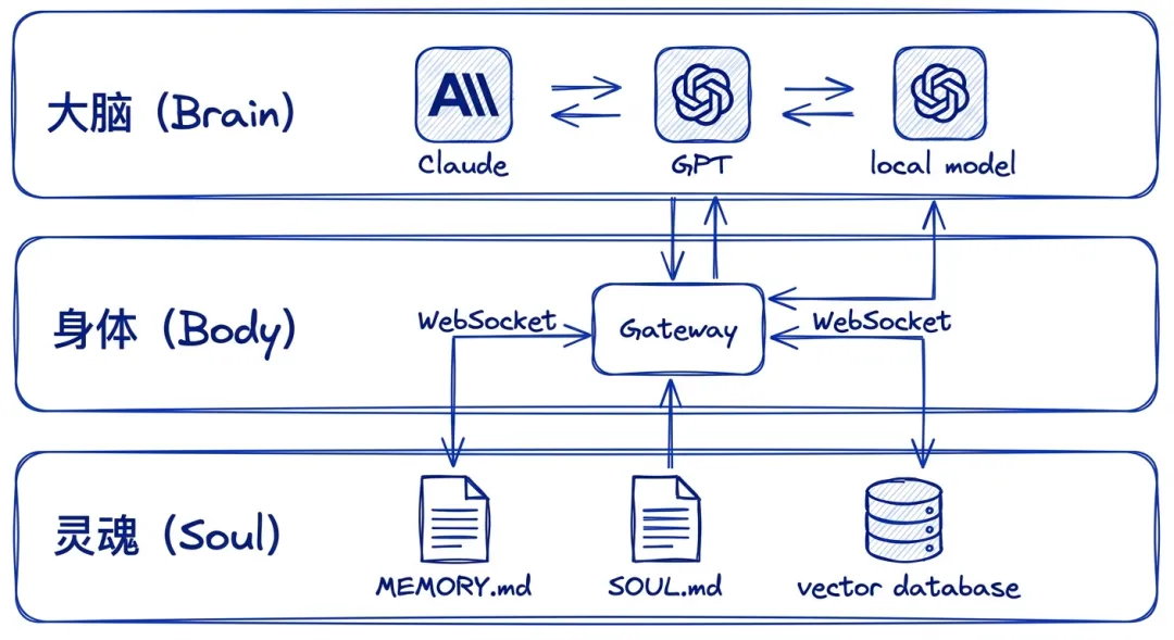 这句话不是口号,它直接决定了整个系统的分层设计。OpenClaw 把自己拆成了三层:Brain(大脑)、Body(身体)、Soul(灵魂)。