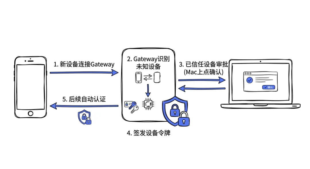 - 新设备(比如你的 iPhone)通过 WebSocket 连接到 Gateway