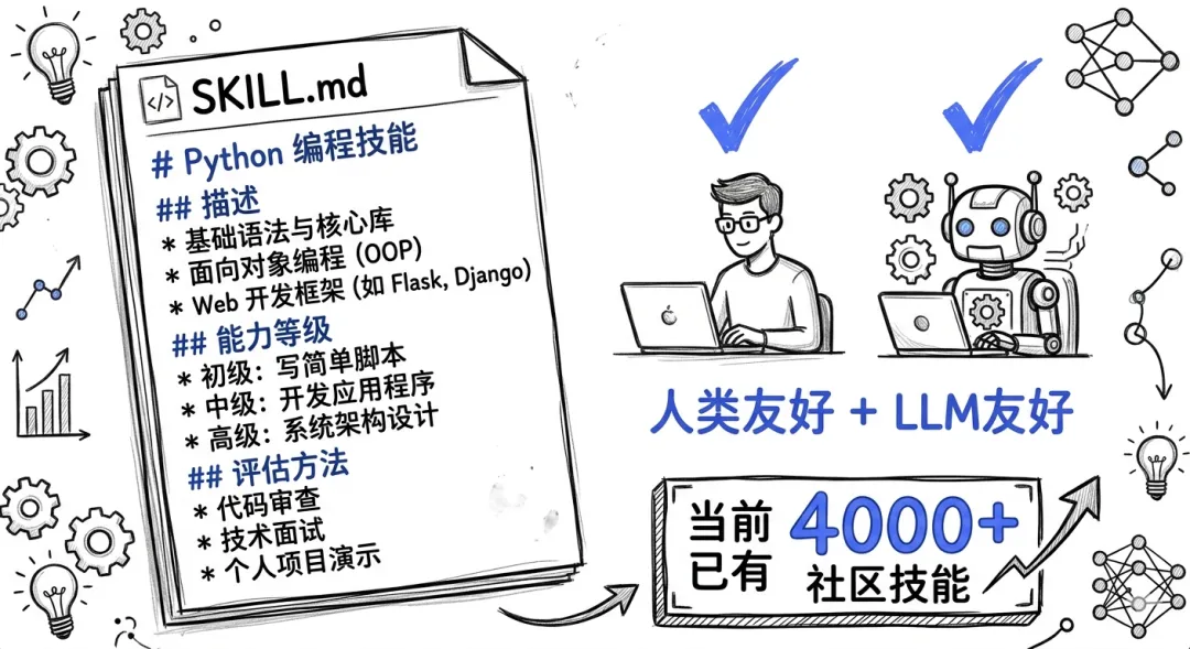 img10:Skill即Markdown的设计理念,左侧是SKILL.md文件内容,右侧是人类和AI都能读懂的双向箭头