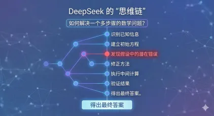 DeepSeek思维链:用户提问 → AI开始"思考" → 自我纠正 → 反思验证 → 最终答案