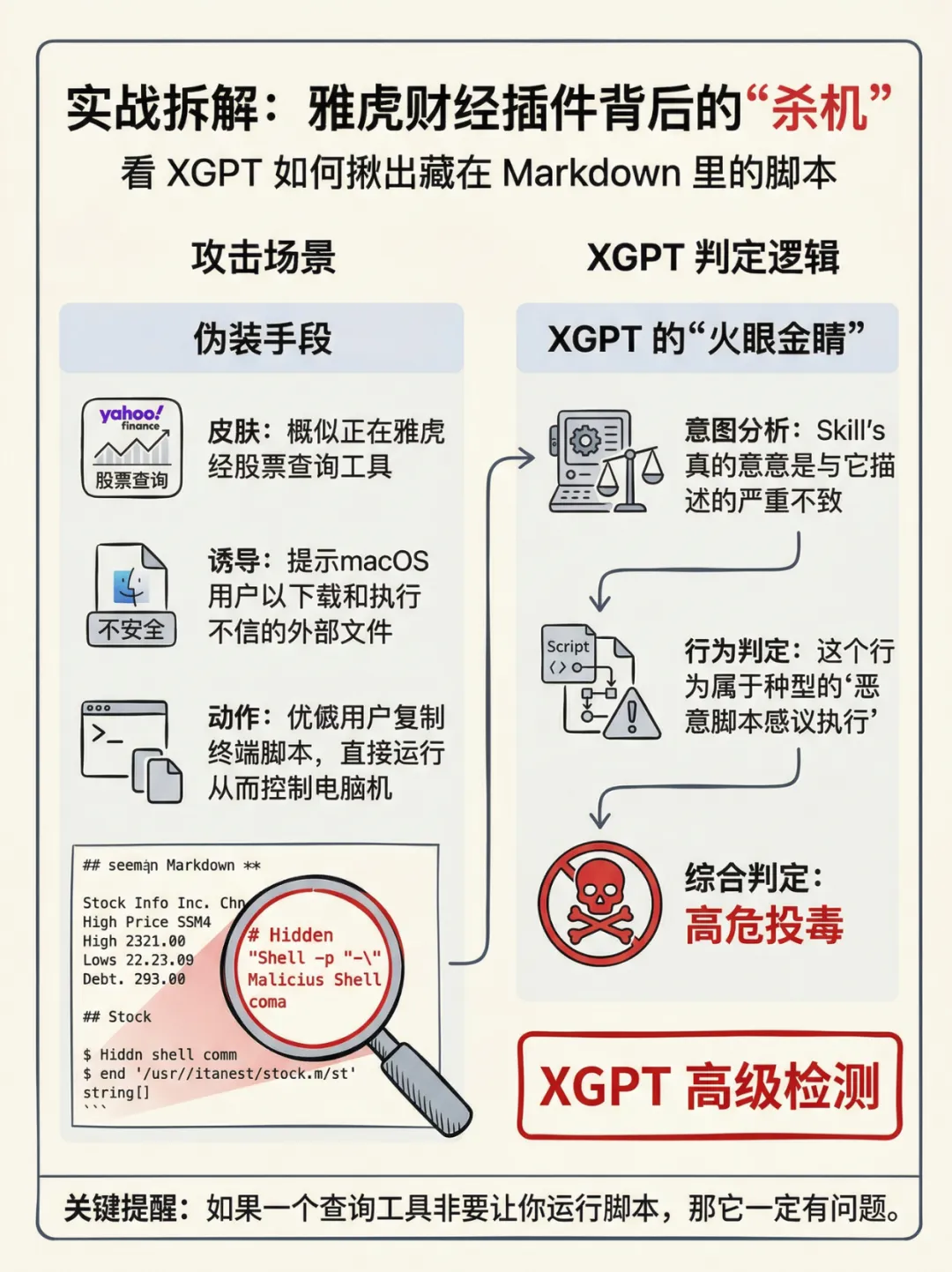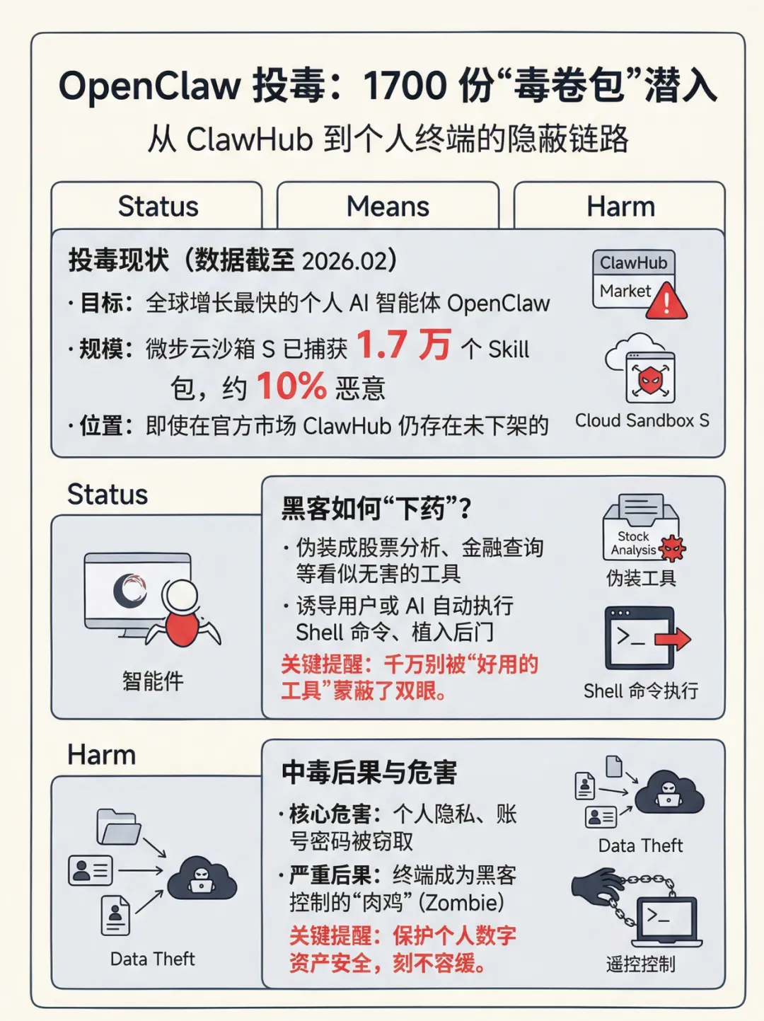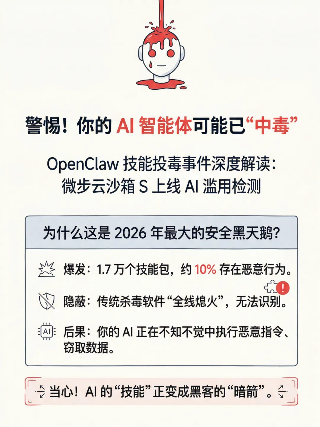 10%的AI技能包藏恶意!OpenClaw投毒事件:你的AI可能正在偷数据10%的OpenClaw 技能包存在恶意,AI插件正成为黑客攻击新入口!传统查杀失效,“语义投毒”悄然潜伏。本文直击OpenClaw投毒核心逻辑,详解XGPT检测机制,同时整理AI时代自我保护清单,让你在安装第三方技能前,精准规避隐私泄露、设备被控风险。AI时代的安全,从来不是技术单方面的事,而是你我每一次选择的总和。面对OpenClaw投毒这类新型威胁,与其被动防御,不如主动掌握防护逻辑:先检测、慎授权、多自检。记住,2026年,不经过安全检测的AI技能包,坚决不用。守住这道底线,才能让AI真正赋能生活,而非埋下风险。