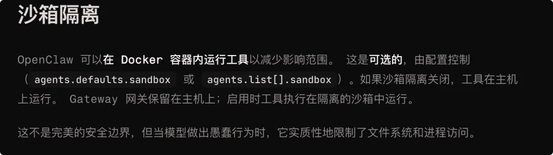 只有开了 Docker sandbox,工具才会被放进隔离环境里。而且官方自己也说了,sandbox 也不是“完美安全边界”,只是能明显降低文件系统和进程访问的爆炸半径。