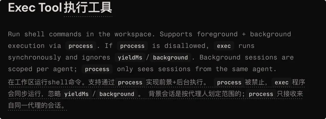 OpenClaw 官方有 exec tool,文档写得也很清楚:它可以在 workspace 里运行 shell commands,还支持配合 process 做前后台执行。