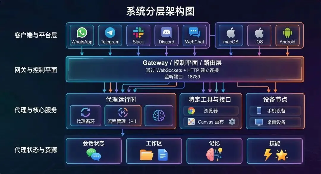 这套分层,决定了 OpenClaw 不是“收到消息 → 调模型 → 回一句话”那么简单。而是一个 有状态、有路由、有并发控制、有设备扩展面的 agent system