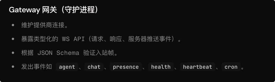 官方文档里写得很清楚,Gateway 负责维护 provider connections,暴露 typed WS API,请求/响应/事件都是同一条协议线上的能力,而且会对入站 frame 做 JSON Schema 校验。