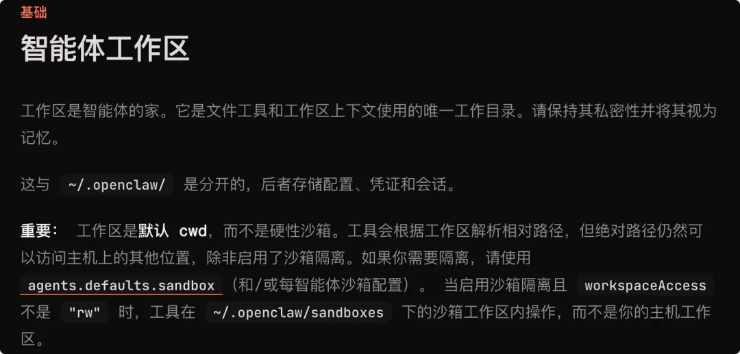 workspace 只是默认 cwd,不是 hard sandbox。 相对路径会默认落在 workspace 里,但绝对路径仍然可能访问宿主机其他位置,除非你显式开启 sandbox。
