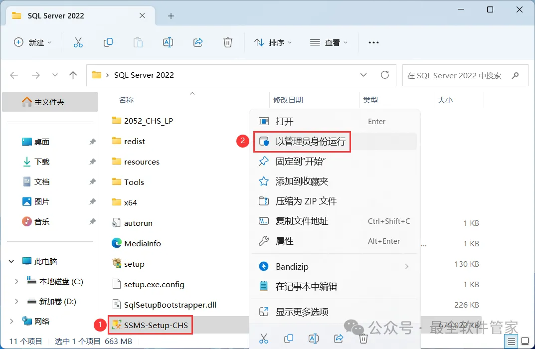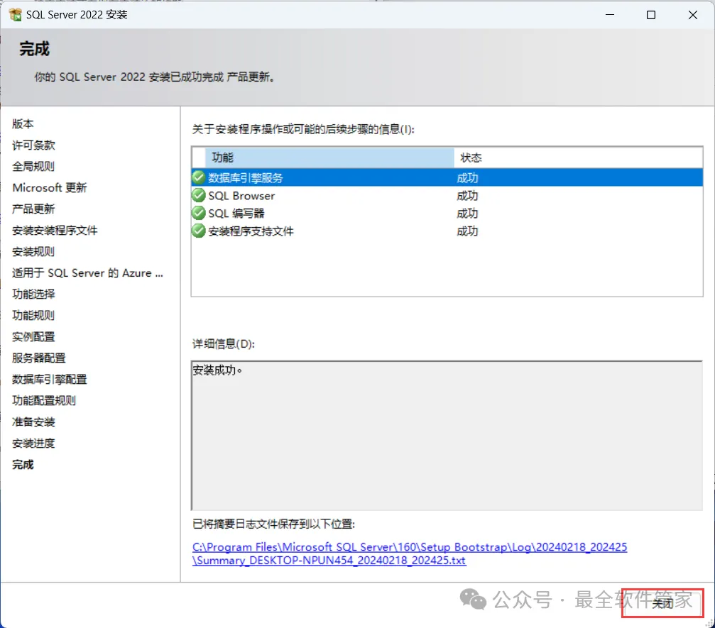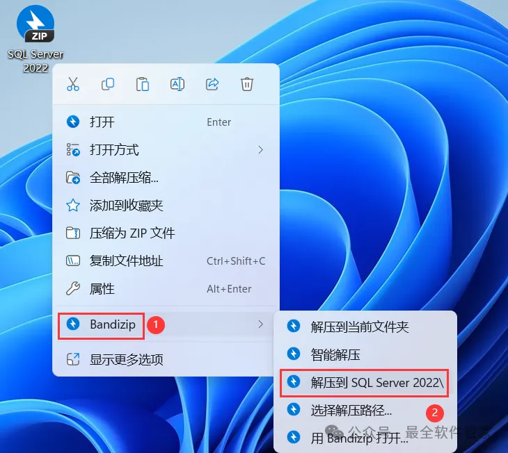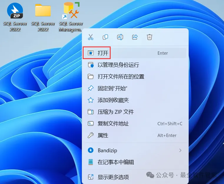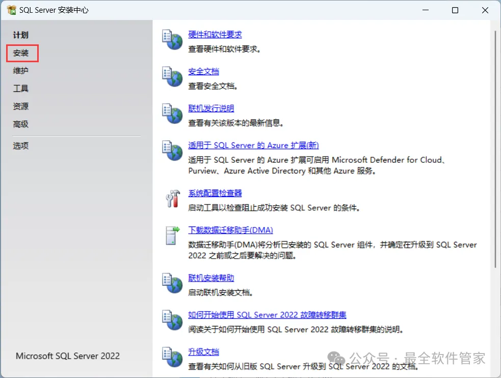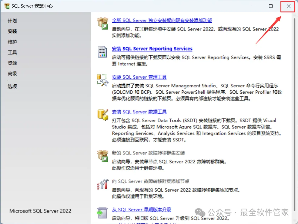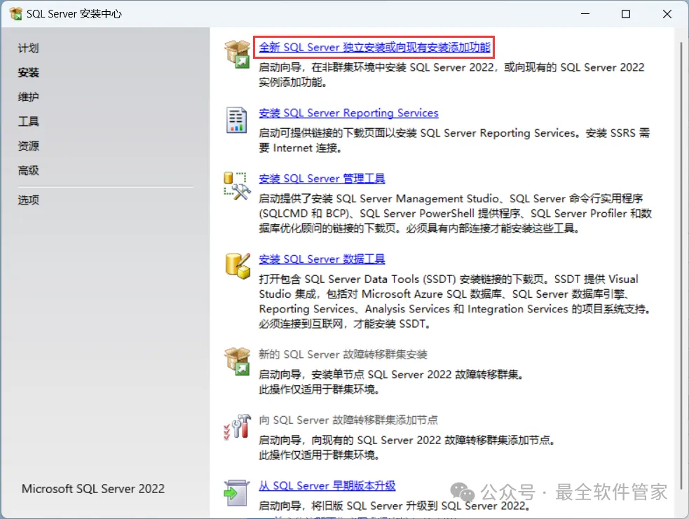安装需知[软件名称]:SQL Server 2022[软件大小]:1.81G[软件语言]:中文简体[安装环境]:Win7及以上版本[下载地址]:公众号内回复:SQLServer[不限速下载]:免费获取百度网盘不限速下载工具。公众号内回复:不限速[注意事项]:安装前请关闭网络、杀毒软件和防火墙,否则易安装失败。公众号内回复:1[解压软件]:小编用的解压软件是Bandizip,获取Bandizip软件安装包。公众号内回复:2安装教程1、下载SQL Server 2022软件安装包到电脑上,右键选择【解压到SQL Server 2022\】2、右键【打开】解压后的文件夹3、找到【setup】应用程序,右键选择【以管理员身份运行】它4、点击【安装】5、点击【全新SQL Server独立安装…】6、点击【下一步】7、勾选【我接受】,再点击【下一步】8、点击【下一步】9、不勾选【适用于…】,再点击【下一步】10、勾选需要安装的实例功能,软件默认安装在C盘,可自定义更改软件安装位置,这里小编选择安装在D盘;再点击【下一步】11、点击【下一步】12、点击【下一步】13、勾选【混合模式】,输入密码和确认密码:设置相同密码,点击【添加当前用户】,再点击【下一步】14、点击【安装】15、软件安装中,稍等片刻16、点击【关闭】17、点击右上角【关闭按钮】18、回到SQL Server 2022文件夹,找到【SSMS-Setup-CHS】应用程序,右键选择【以管理员身份运行】它19、点击【安装】20、软件安装中,稍等片刻21、点击【关闭】22、回到桌面,点击任务栏的【开始菜单】,在【所有应用】中找到【SQL ServerManagement Studio 19软件图标】,将软件图标拖到桌面上,完成软件桌面快捷方式的创建23、右键桌面上的【SQL ServerManagement Studio 19软件图标】,点击【打开】24、软件正在打开,启动界面如下:25、点击【连接】26、软件打开成功,运行界面如下:27、以上就是SQL Server 2022软件安装的全过程,要是对你有帮助的话,请为小编点个赞!免责声明:软件资源均来源于网络,仅供用户交流学习与研究使用,版权归属原版权方所有,版权争议与本公众号无关,用户本人下载后不能用作商业或非法用途,否则后果均由用户承担责任;如果您访问和下载此文件,表示您同意只将此软件用于参考、学习而非其他用途,否则一切后果请您自行承担,请于下载后24小时内删除,不允许用于商业用途,否则法律问题自行承担。如果您喜欢该软件,请支持正版软件,购买注册,得到更好的正版服务。