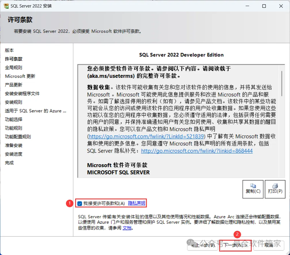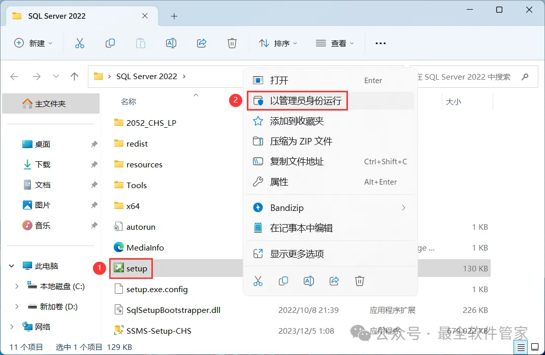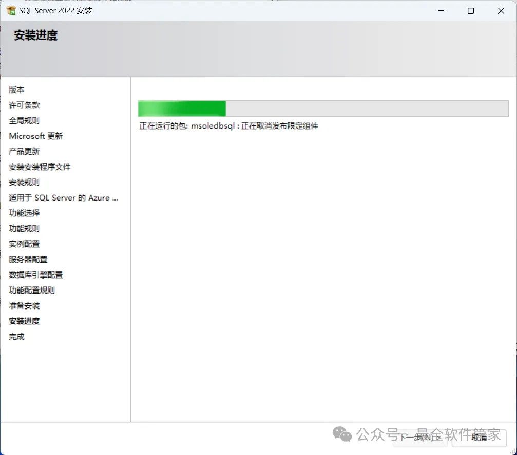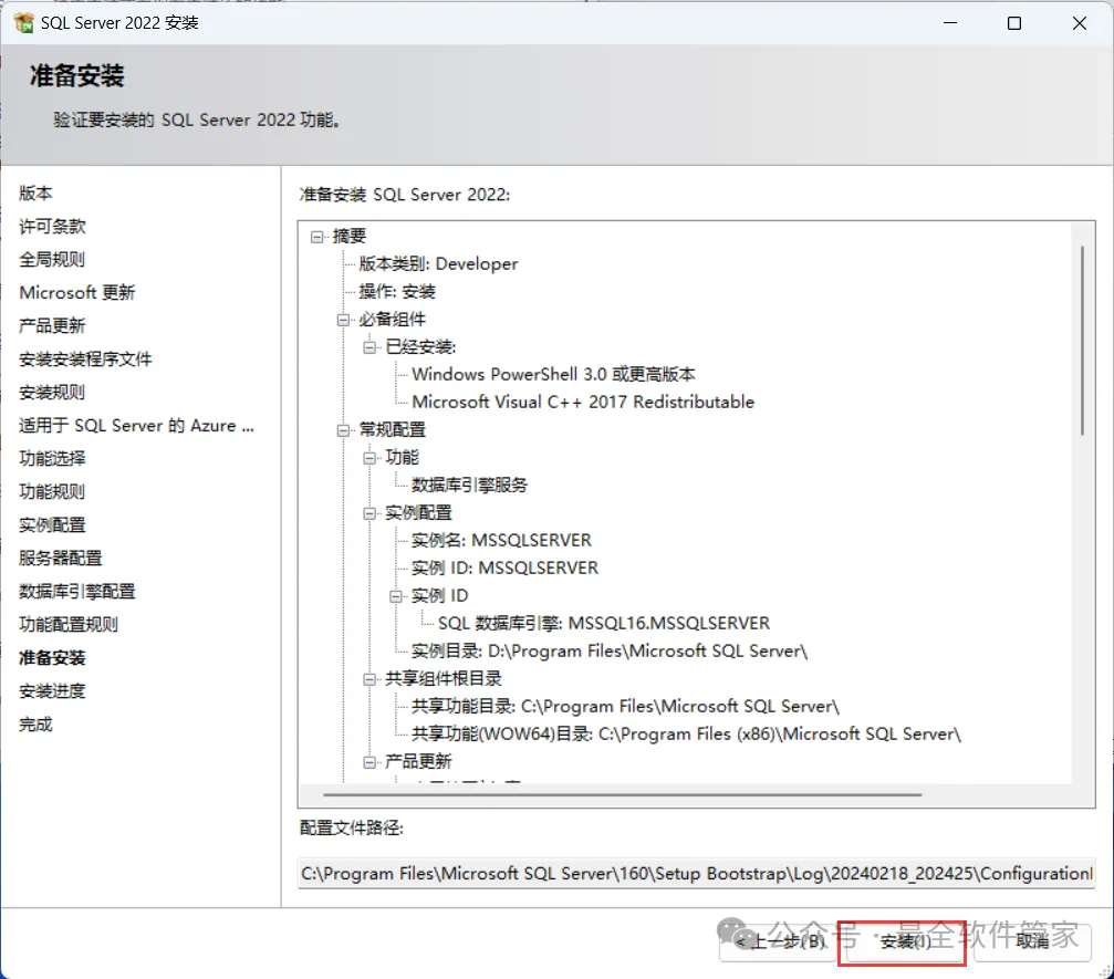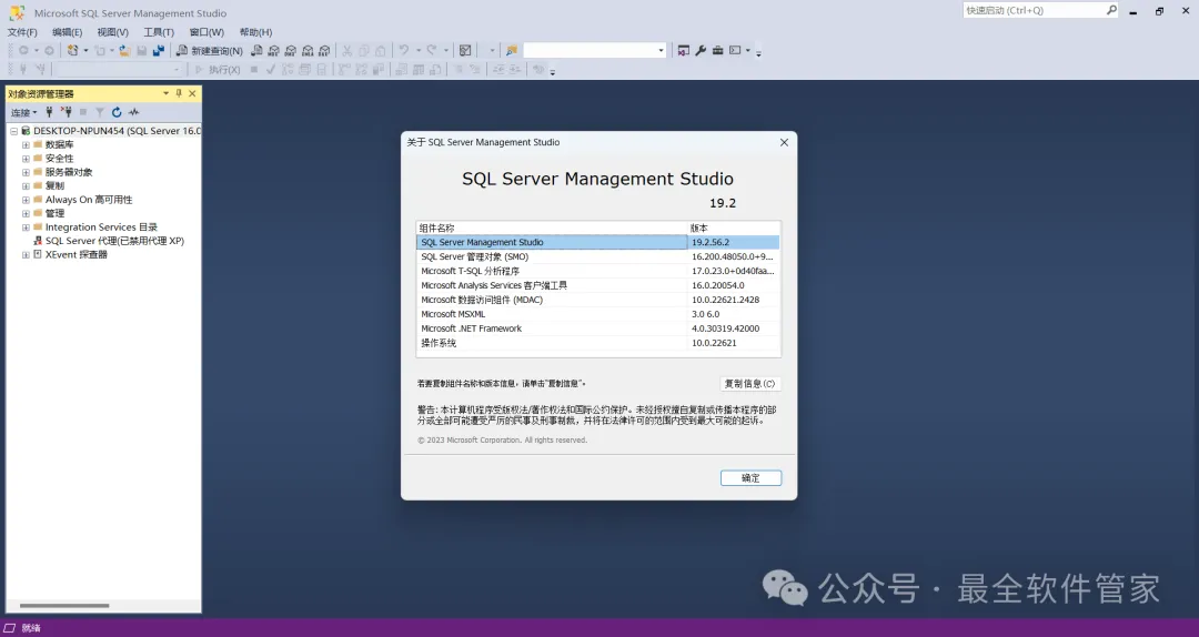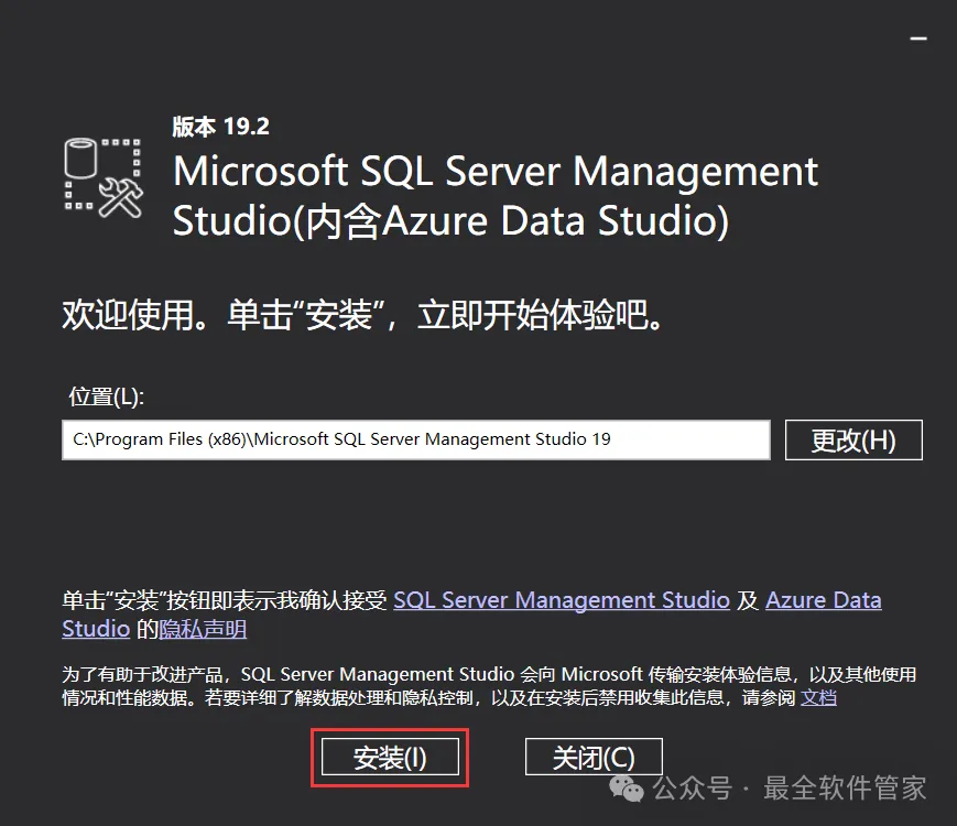 安装需知[软件名称]:SQL Server 2022[软件大小]:1.81G[软件语言]:中文简体[安装环境]:Win7及以上版本[下载地址]:公众号内回复:SQLServer[不限速下载]:免费获取百度网盘不限速下载工具。公众号内回复:不限速[注意事项]:安装前请关闭网络、杀毒软件和防火墙,否则易安装失败。公众号内回复:1[解压软件]:小编用的解压软件是Bandizip,获取Bandizip软件安装包。公众号内回复:2安装教程1、下载SQL Server 2022软件安装包到电脑上,右键选择【解压到SQL Server 2022\】2、右键【打开】解压后的文件夹3、找到【setup】应用程序,右键选择【以管理员身份运行】它4、点击【安装】5、点击【全新SQL Server独立安装…】6、点击【下一步】7、勾选【我接受】,再点击【下一步】8、点击【下一步】9、不勾选【适用于…】,再点击【下一步】10、勾选需要安装的实例功能,软件默认安装在C盘,可自定义更改软件安装位置,这里小编选择安装在D盘;再点击【下一步】11、点击【下一步】12、点击【下一步】13、勾选【混合模式】,输入密码和确认密码:设置相同密码,点击【添加当前用户】,再点击【下一步】14、点击【安装】15、软件安装中,稍等片刻16、点击【关闭】17、点击右上角【关闭按钮】18、回到SQL Server 2022文件夹,找到【SSMS-Setup-CHS】应用程序,右键选择【以管理员身份运行】它19、点击【安装】20、软件安装中,稍等片刻21、点击【关闭】22、回到桌面,点击任务栏的【开始菜单】,在【所有应用】中找到【SQL ServerManagement Studio 19软件图标】,将软件图标拖到桌面上,完成软件桌面快捷方式的创建23、右键桌面上的【SQL ServerManagement Studio 19软件图标】,点击【打开】24、软件正在打开,启动界面如下:25、点击【连接】26、软件打开成功,运行界面如下:27、以上就是SQL Server 2022软件安装的全过程,要是对你有帮助的话,请为小编点个赞!免责声明:软件资源均来源于网络,仅供用户交流学习与研究使用,版权归属原版权方所有,版权争议与本公众号无关,用户本人下载后不能用作商业或非法用途,否则后果均由用户承担责任;如果您访问和下载此文件,表示您同意只将此软件用于参考、学习而非其他用途,否则一切后果请您自行承担,请于下载后24小时内删除,不允许用于商业用途,否则法律问题自行承担。如果您喜欢该软件,请支持正版软件,购买注册,得到更好的正版服务。
