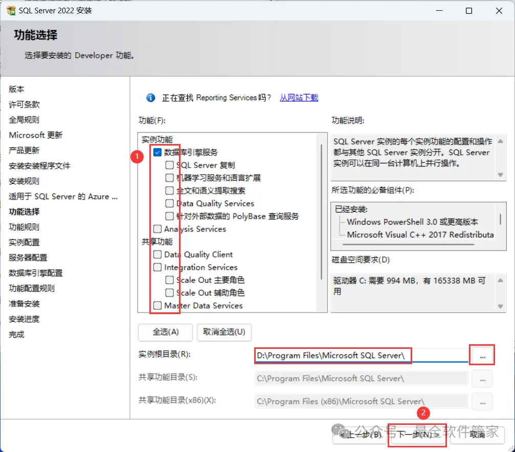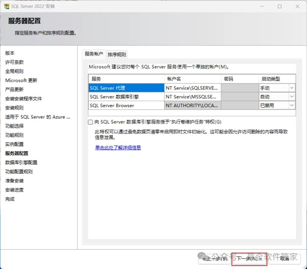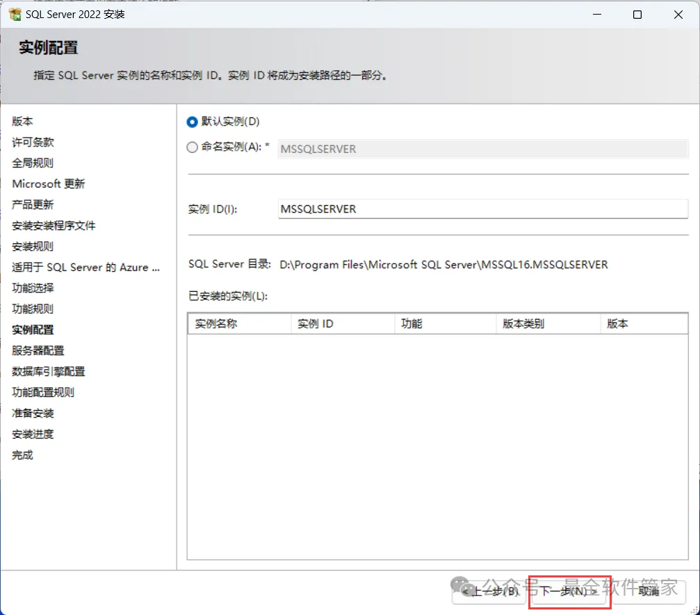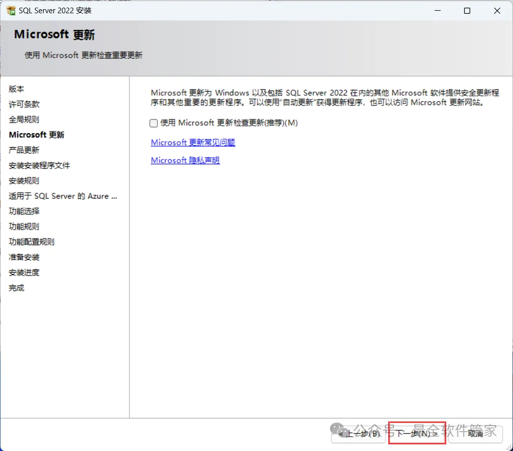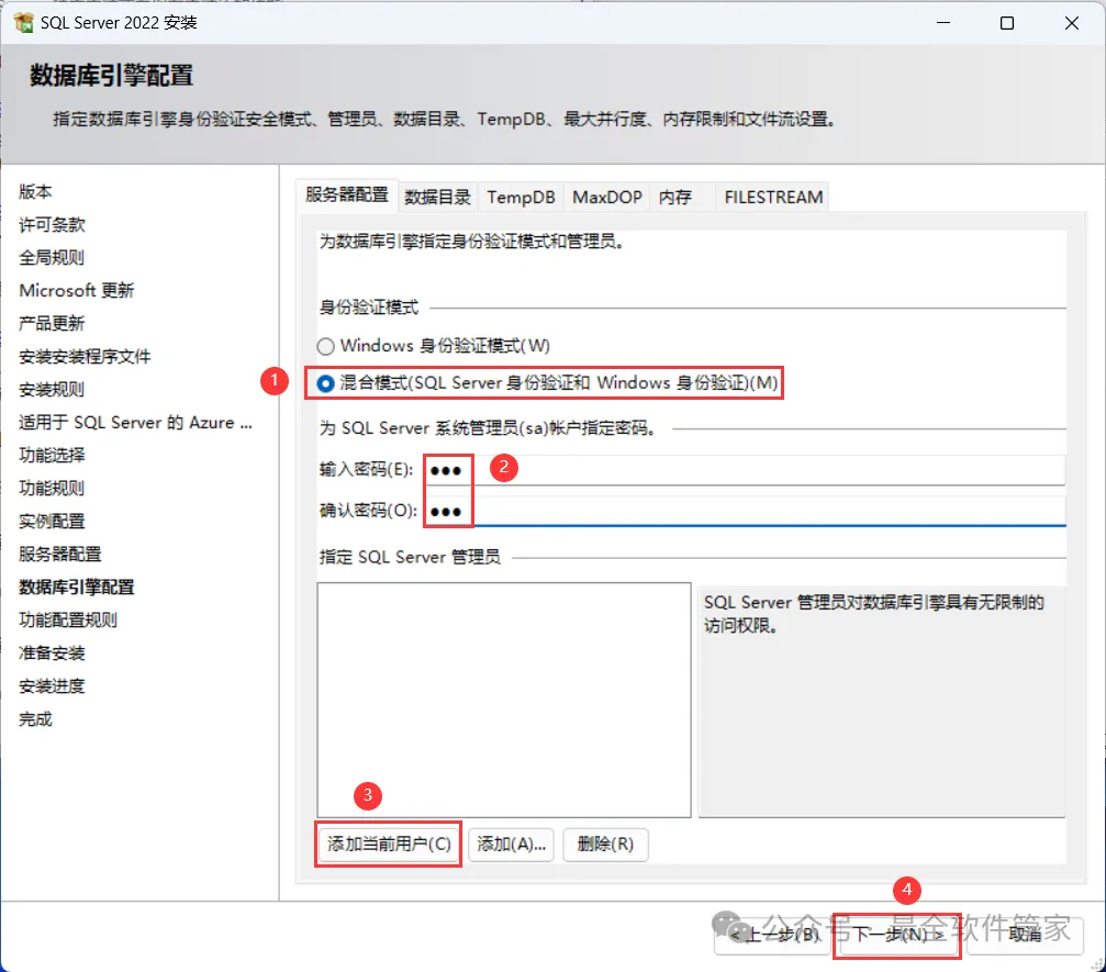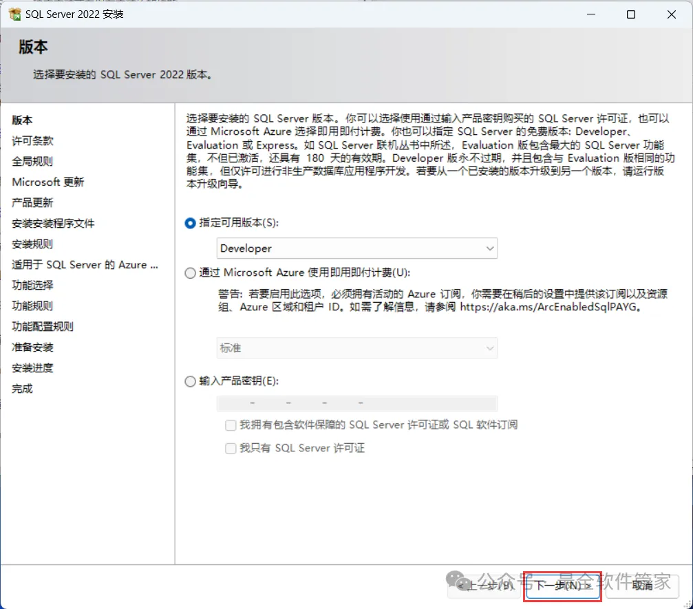 安装需知[软件名称]:SQL Server 2022[软件大小]:1.81G[软件语言]:中文简体[安装环境]:Win7及以上版本[下载地址]:公众号内回复:SQLServer[不限速下载]:免费获取百度网盘不限速下载工具。公众号内回复:不限速[注意事项]:安装前请关闭网络、杀毒软件和防火墙,否则易安装失败。公众号内回复:1[解压软件]:小编用的解压软件是Bandizip,获取Bandizip软件安装包。公众号内回复:2安装教程1、下载SQL Server 2022软件安装包到电脑上,右键选择【解压到SQL Server 2022\】2、右键【打开】解压后的文件夹3、找到【setup】应用程序,右键选择【以管理员身份运行】它4、点击【安装】5、点击【全新SQL Server独立安装…】6、点击【下一步】7、勾选【我接受】,再点击【下一步】8、点击【下一步】9、不勾选【适用于…】,再点击【下一步】10、勾选需要安装的实例功能,软件默认安装在C盘,可自定义更改软件安装位置,这里小编选择安装在D盘;再点击【下一步】11、点击【下一步】12、点击【下一步】13、勾选【混合模式】,输入密码和确认密码:设置相同密码,点击【添加当前用户】,再点击【下一步】14、点击【安装】15、软件安装中,稍等片刻16、点击【关闭】17、点击右上角【关闭按钮】18、回到SQL Server 2022文件夹,找到【SSMS-Setup-CHS】应用程序,右键选择【以管理员身份运行】它19、点击【安装】20、软件安装中,稍等片刻21、点击【关闭】22、回到桌面,点击任务栏的【开始菜单】,在【所有应用】中找到【SQL ServerManagement Studio 19软件图标】,将软件图标拖到桌面上,完成软件桌面快捷方式的创建23、右键桌面上的【SQL ServerManagement Studio 19软件图标】,点击【打开】24、软件正在打开,启动界面如下:25、点击【连接】26、软件打开成功,运行界面如下:27、以上就是SQL Server 2022软件安装的全过程,要是对你有帮助的话,请为小编点个赞!免责声明:软件资源均来源于网络,仅供用户交流学习与研究使用,版权归属原版权方所有,版权争议与本公众号无关,用户本人下载后不能用作商业或非法用途,否则后果均由用户承担责任;如果您访问和下载此文件,表示您同意只将此软件用于参考、学习而非其他用途,否则一切后果请您自行承担,请于下载后24小时内删除,不允许用于商业用途,否则法律问题自行承担。如果您喜欢该软件,请支持正版软件,购买注册,得到更好的正版服务。