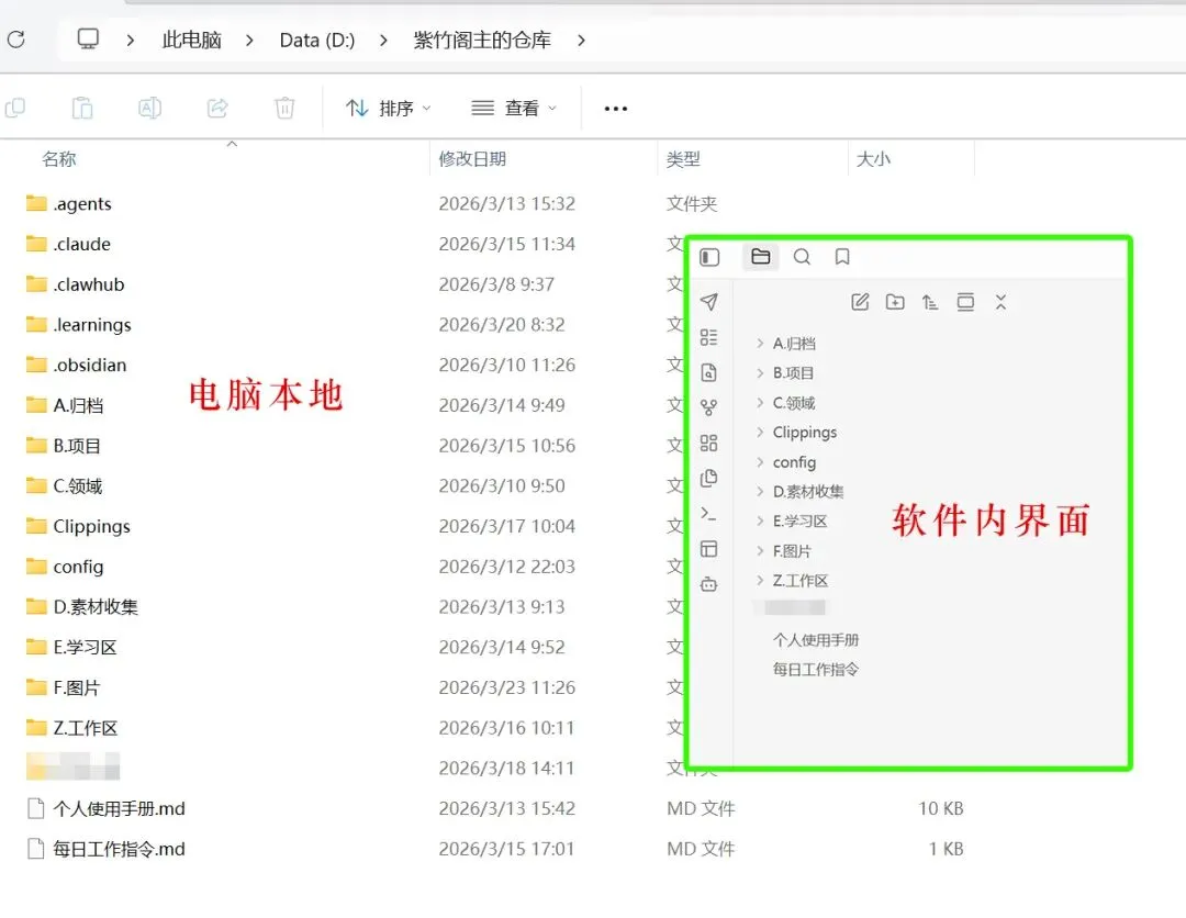 Obsidian是存储层:你的所有知识、笔记、素材都在这里,本地可控。
