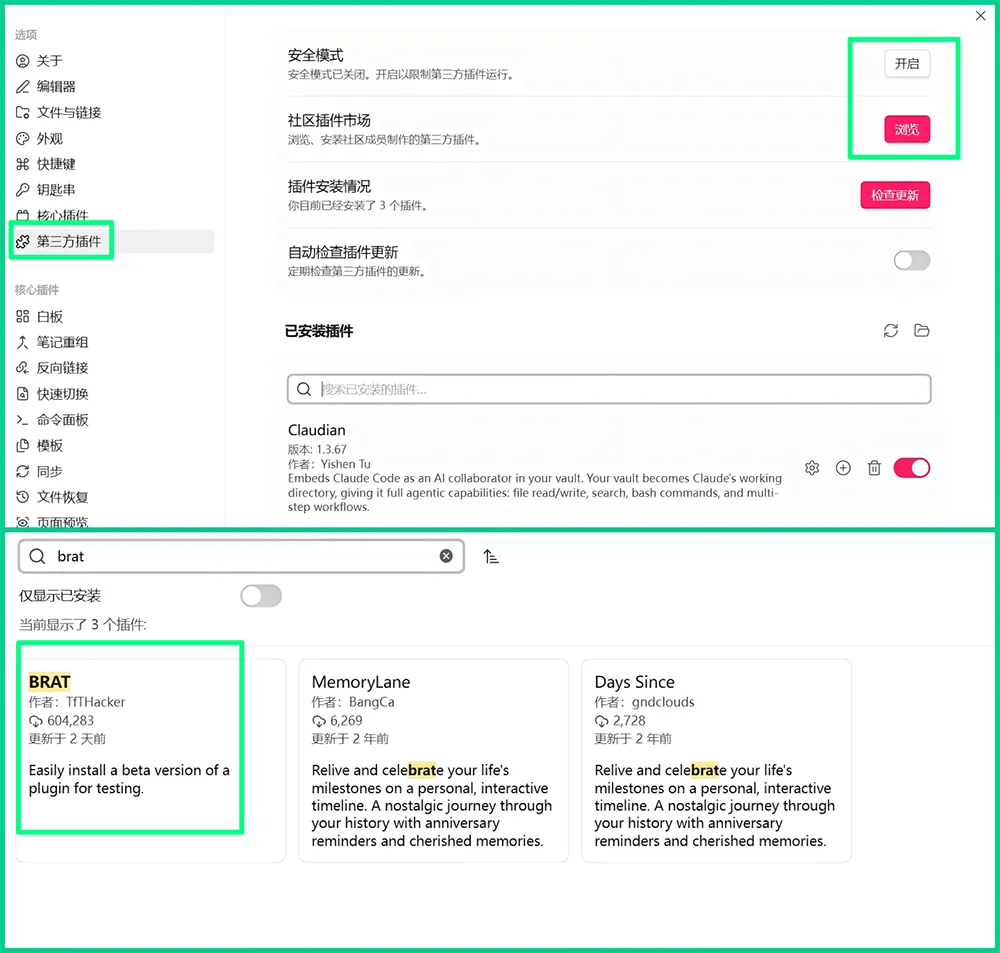 在线安装:在obisidian的插件里面,关闭安全模式,再安装brat插件,因为Claudian没有上架到市场,所需需要brat来安装。