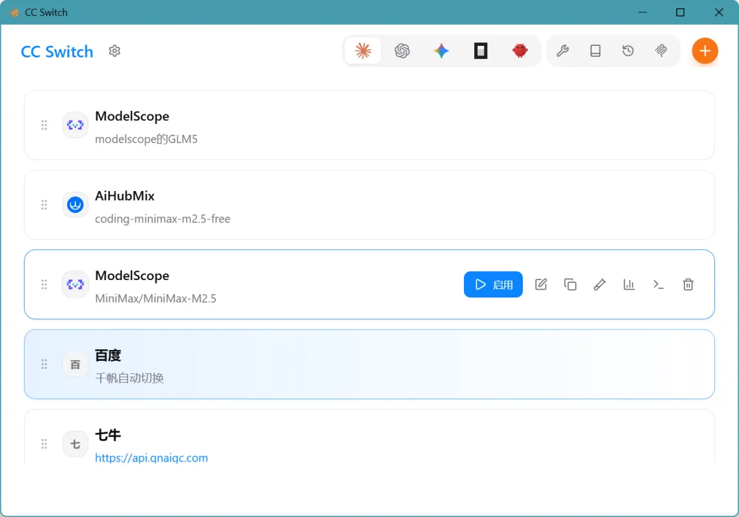 到这里三个工具都搞定了,那么就必须对接大脑了,就是给claude code一个AI大模型脑子,官方的opus好用,贵,容易封号,阁主使用的就是GLM5,那么就要涉及到下面这个工具了,超级好用,管理对接你的api