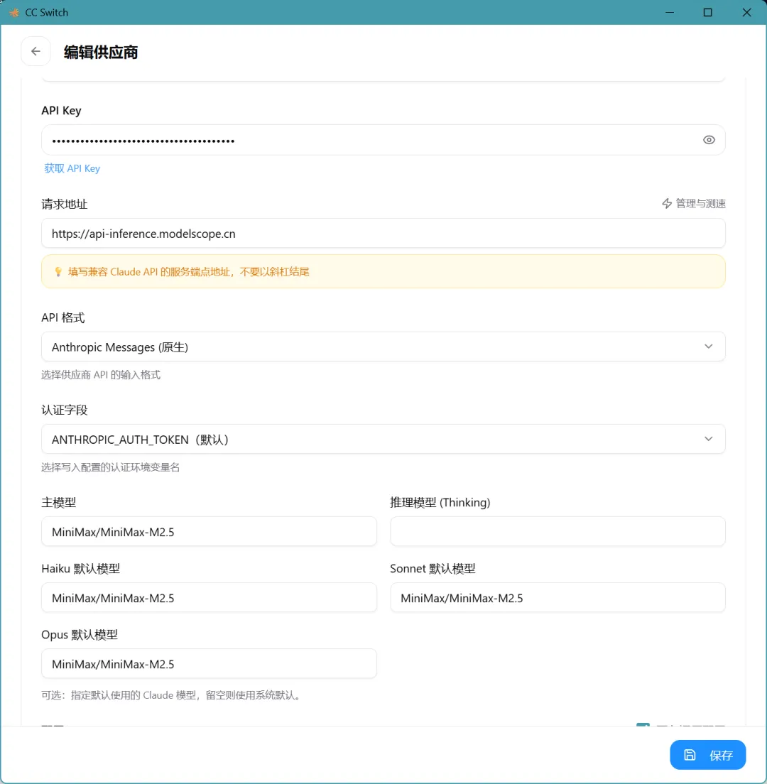 拿modelscope举例,去官网获取你的api key,填入最上方,请求地址cc switch里面配置好了,然后复制你的模型id,填入到下面的模型里面,比如minimax-2.5,注意不要填写错了,官网有模型的id,保存就可以了,你的大模型就配置好了!