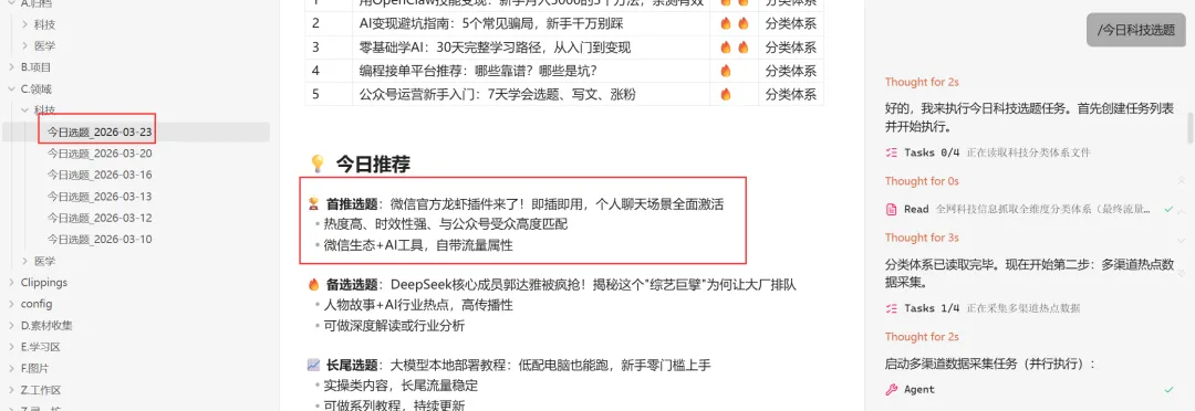 大家喜欢用小龙虾去自动推送你的订阅消息,这里我也设置了一个,平常需要相关的选题,科技类的,我直接调用这个命令,自动去给我选题,然后放到我的笔记里面,这份笔记还会对比这些选题,我写的微信的clawbot就是这样的。这个任务也是我让AI帮我生成的。