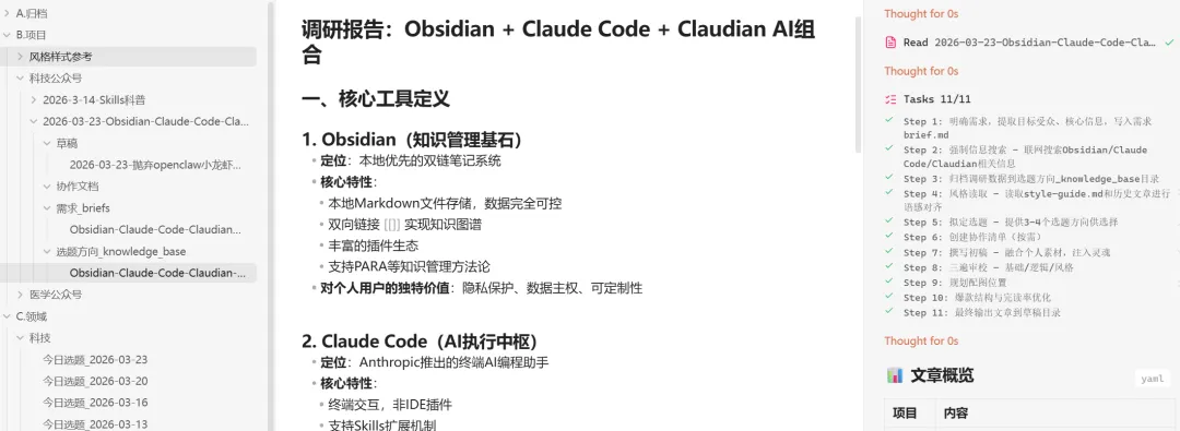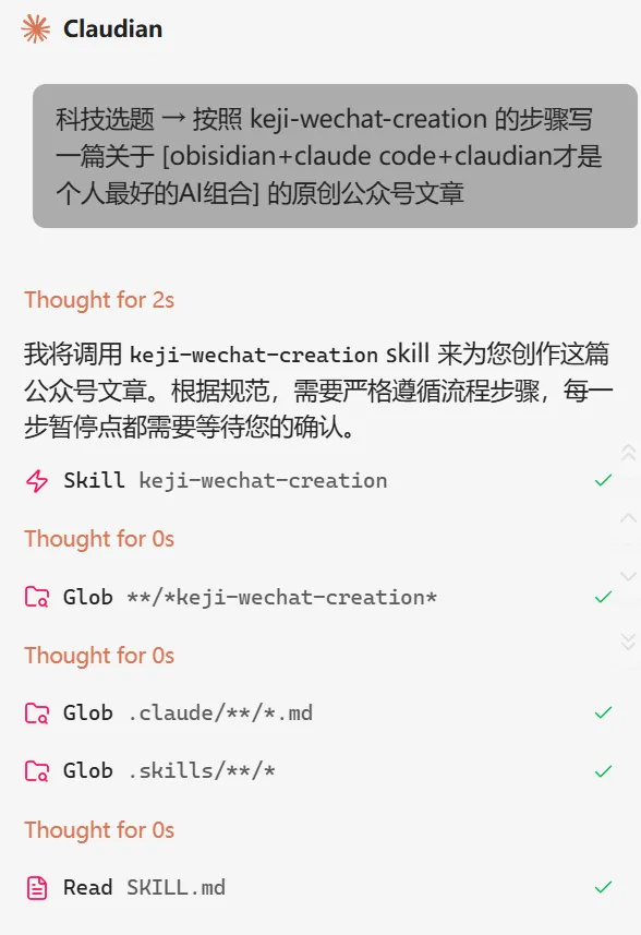 整个skill分为11步,来帮我写文章,首先我给了AI一个话题,比如这篇文章obisidian+claude code+claudian这个话题