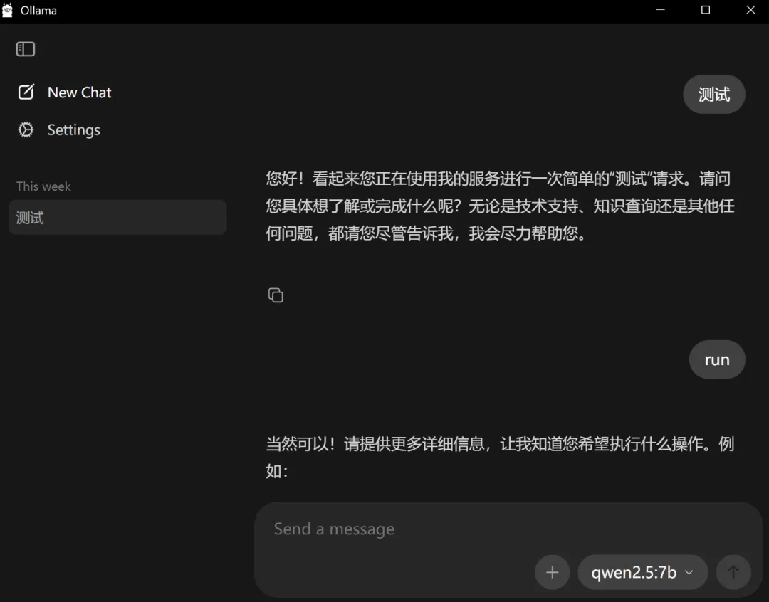 #拉取模型ollama pull qwen2.5:7b#加载模型ollama run qwen2.5:7b