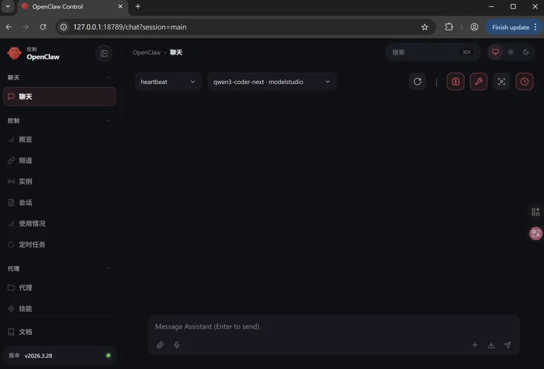 注:(1)在Model/auth provider选择Ollama(就可以用本地模型,因为openclaw在docker里面,所以Ollama base URL的地址http://127.0.0.1:11434需要修改为http://host.docker.internal:11434)- 登录网页版(查看带token的登录地址,或者查看安装位置的openclaw.json也可以)