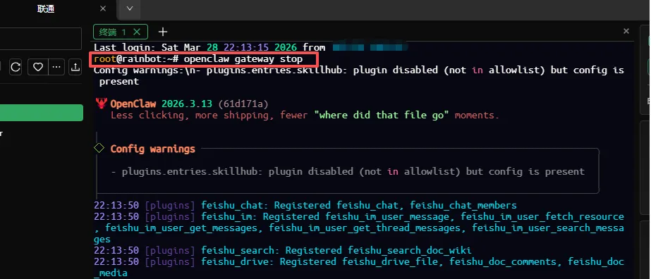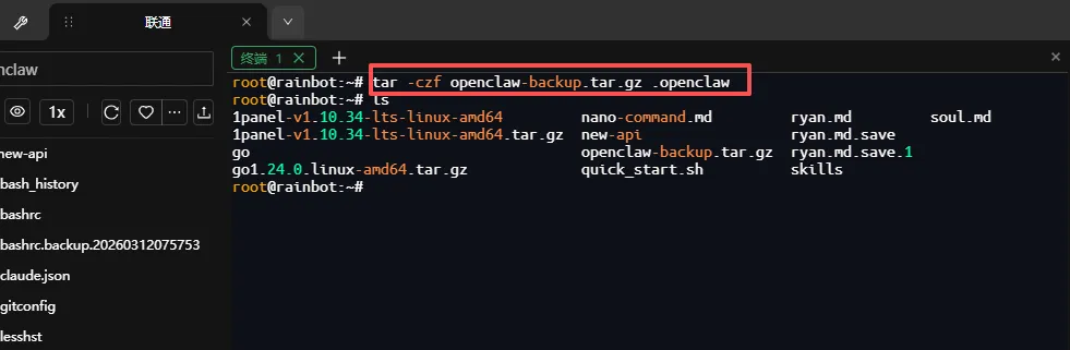 # 1. 停止服务openclaw gateway stop# 2. 打包所有数据cd ~tar -czf openclaw-backup.tar.gz .openclaw /root/.openclaw看到这里的截图了吗?这就是停止服务的正确姿势。