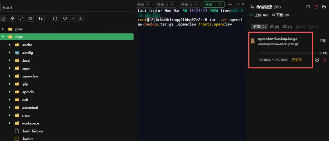 # 替换成你的服务器 IPscp 你的用户名@旧服务器IP:~/openclaw-backup.tar.gz .方式二:图形化工具更熟悉的传输方式,Xterminal、FileZilla、MobaXterm等都行。