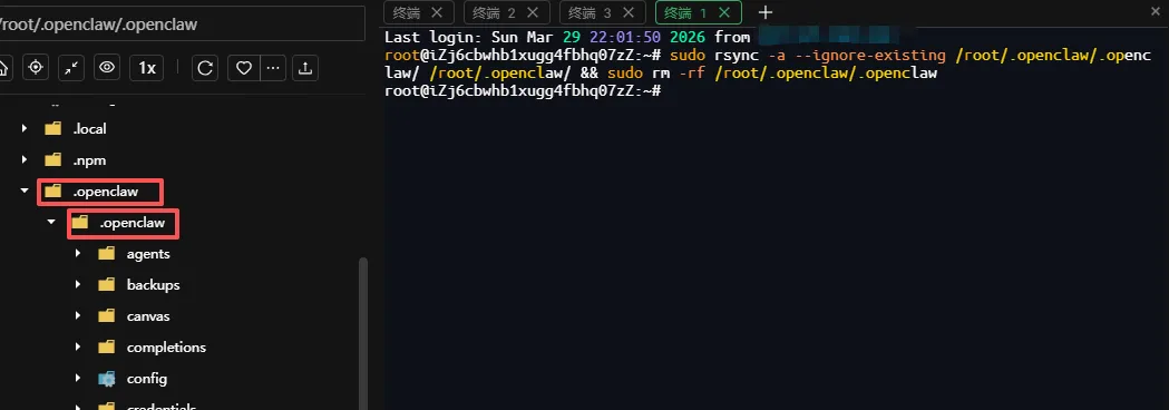 sudo rsync -a --ignore-existing /root/.openclaw/.openclaw/ /root/.openclaw/ && sudo rm -rf /root/.openclaw/.openclaw--ignore-existing确保目标目录中的文件不会被覆盖(即以/root/.openclaw为准),最后删除空的源目录。