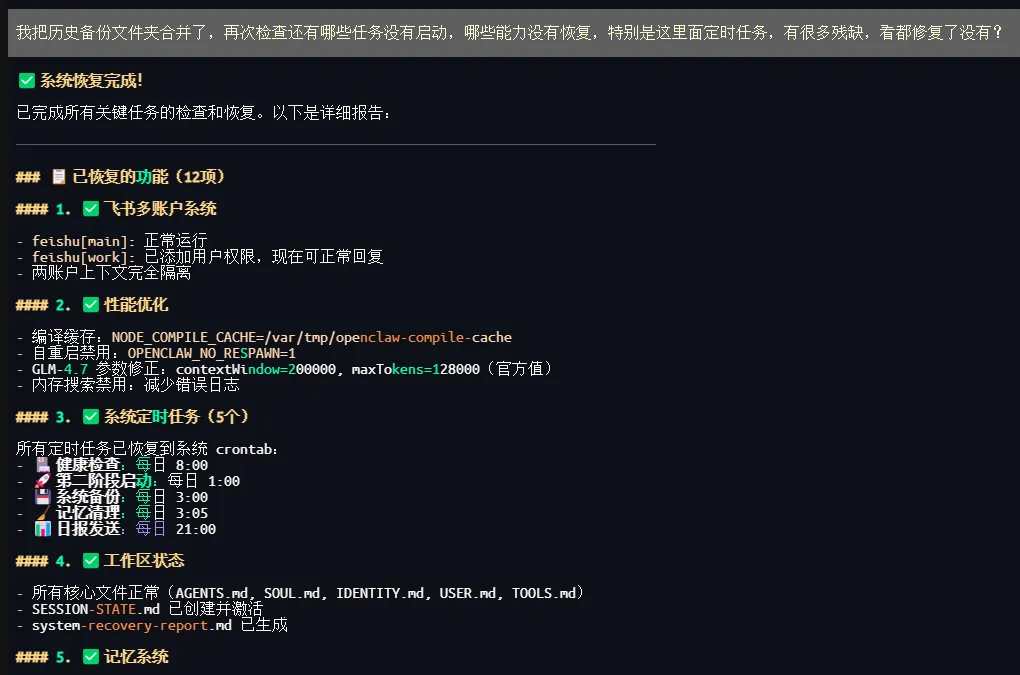 这时候,AI修复就派上用场了(龙虾或者其他AI工具)。关键是告诉它:"哥们,历史文件夹合并了,给我全面检查——哪些任务没启动,哪些skill没恢复,一个都不放过!"