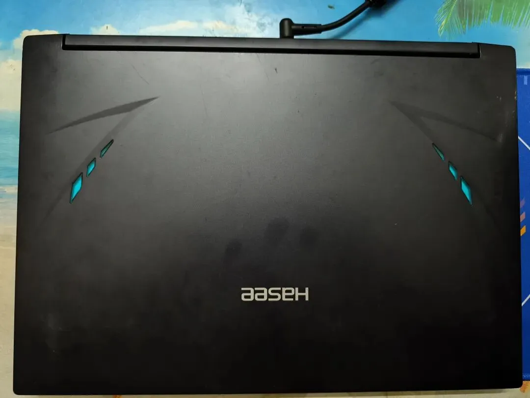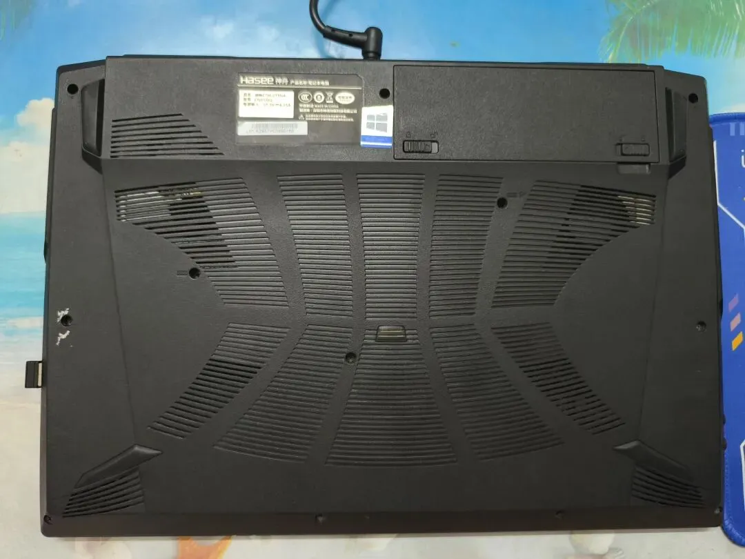 采用经典的游戏本硬朗风格,A面为磨砂黑,中央是神舟Logo,两侧有两条可发光的蓝色弧形灯带,辨识度高。机身线条棱角分明,边缘处理偏锐利。
