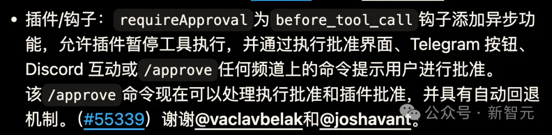 最夸张的,是插件系统加入了一个叫 requireApproval 的异步拦截功能。