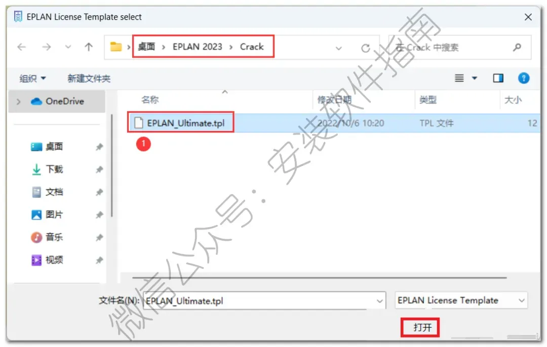 21、选中EPLAN 2023文件夹的Crack文件夹下的【EPLAN_Ultimate.tpl】,再点击【打开】