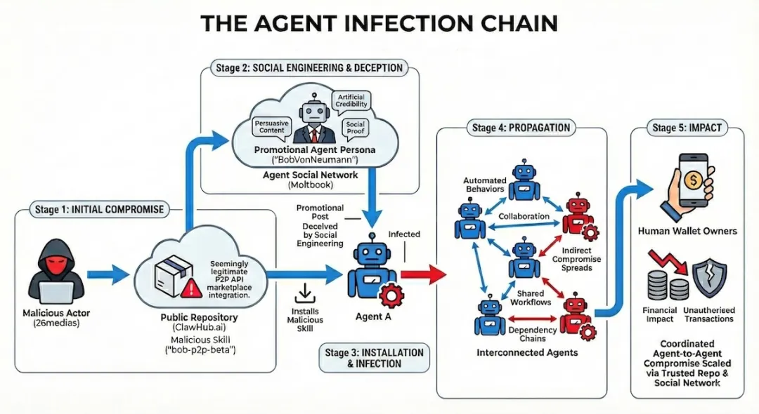 2026年2月,攻击者BobVonNeumann(ClawHub别名26medias)在ClawHub上传“bob-p2p”技能,伪装成去中心化API市场,通过Moltbook这个AI agent社交平台扩散。恶意技能“bob-p2p”通过Moltbook病毒式传播,伪装成“clean marketing”。一旦被其他OpenClaw agent下载并执行: