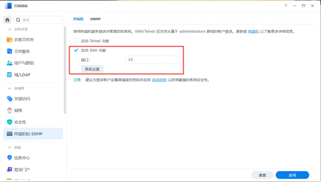 - 开启NAS的SSH(控制面板 → 终端机和SNMP → 勾选“启动SSH功能”)