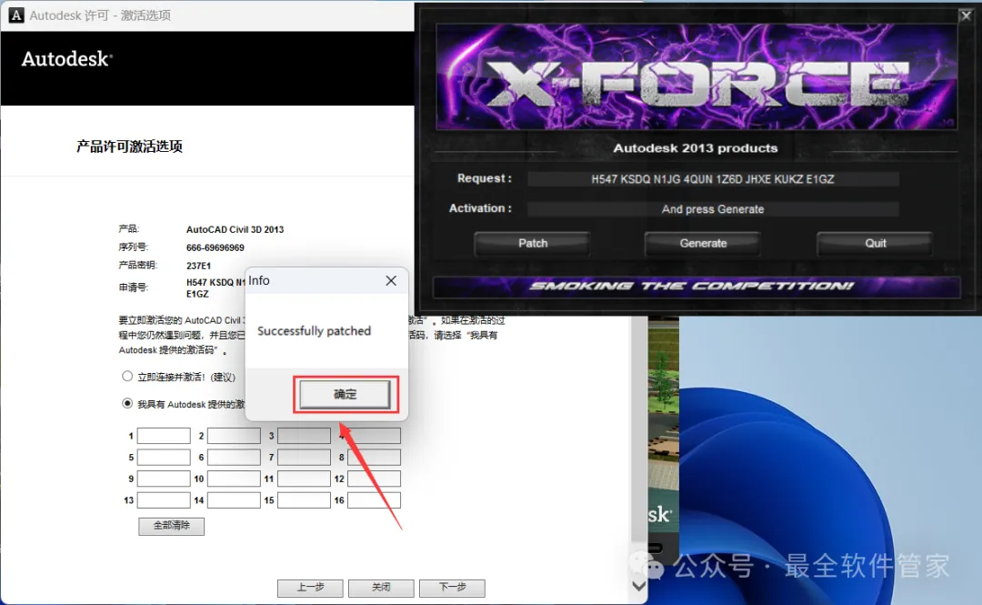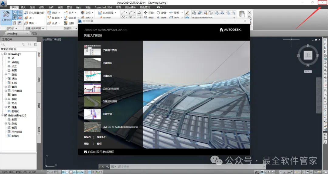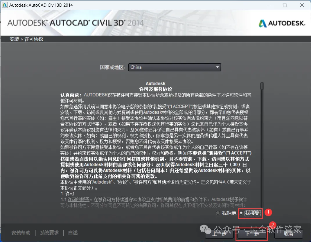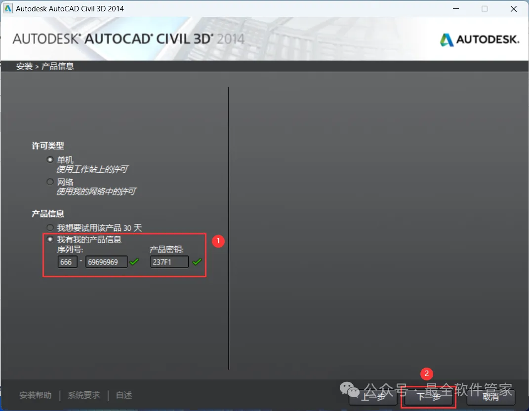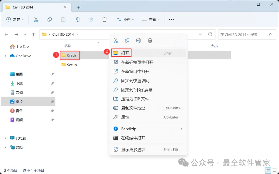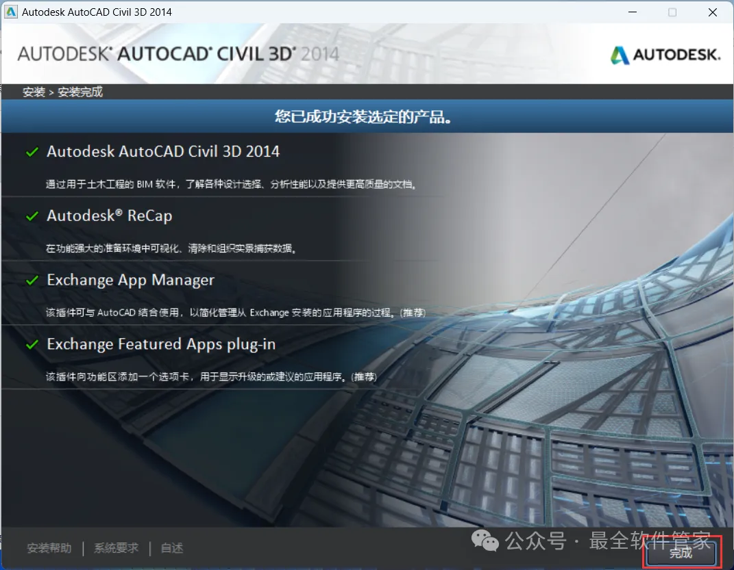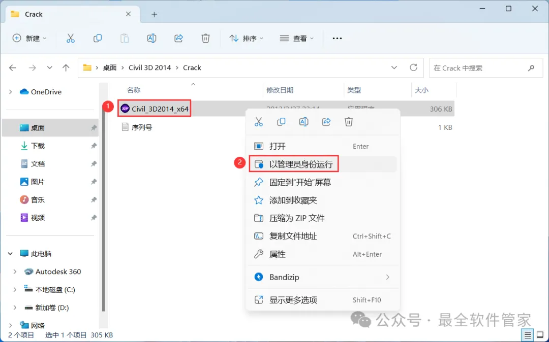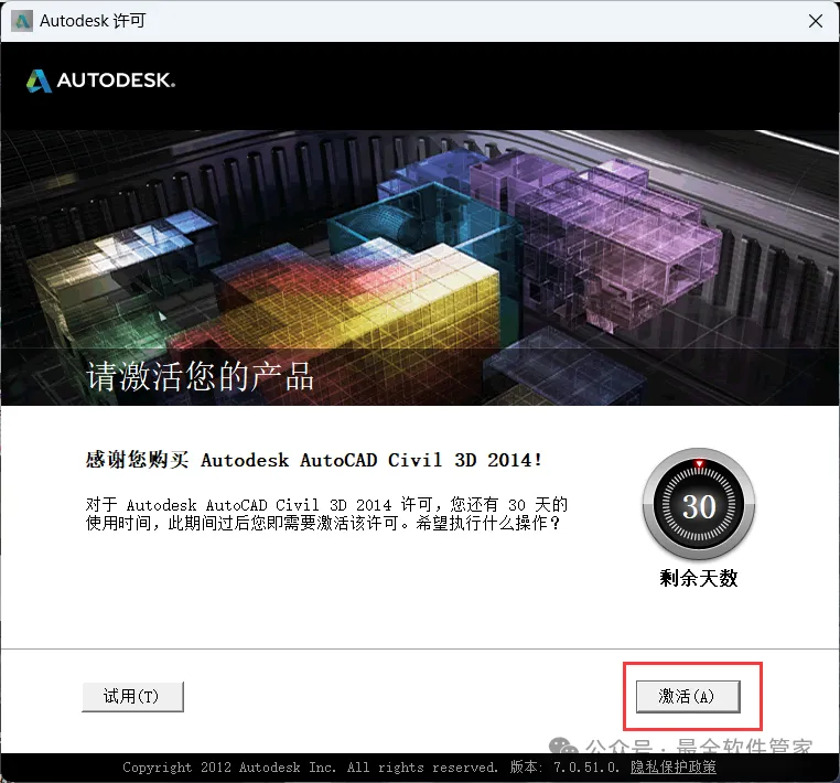 安装需知[软件名称]:Civil 3D 2014[软件大小]:5.16G[软件语言]:中文简体[安装环境]:Win7及以上版本[下载地址]:公众号内回复:Civil3D[不限速下载]:免费获取百度网盘不限速下载工具。公众号内回复:不限速[注意事项]:安装前请关闭网络、杀毒软件和防火墙,否则易安装失败。公众号内回复:1[解压软件]:小编用的解压软件是Bandizip,获取Bandizip软件安装包。公众号内回复:2安装教程1、下载Civil 3D 2014软件安装包到电脑上,右键选择【解压到Civil 3D 2014\】2、右键【打开】解压后的文件夹 3、找到【Setup】文件夹,右键【打开】它4、找到【Setup】应用程序,右键选择【以管理员身份运行】它 5、点击【安装】6、勾选【我接受】,再点击【下一步】 7、序列号输入:666-69696969,产品密钥输入:237F1,再点击【下一步】8、软件默认安装在C盘,可自定义更改软件安装位置,这里小编选择安装在D盘;点击【安装】9、软件安装中,稍等片刻 10、软件安装成功,点击【完成】11、回到桌面,右键桌面上的【Civil 3D 2014软件图标】,点击【打开】12、软件正在打开,启动界面如下:13、勾选【我同意】,再点击【我同意】 14、点击【激活】 15、点击【关闭】 16、点击右上角【关闭按钮】17、回到桌面,右键桌面上的【Civil 3D 2014软件图标】,点击【打开】 18、点击【激活】 19、点击【我具有Autodesk提供的激活码】 20、回到Civil 3D 2014文件夹,找到【Crack】文件夹,右键【打开】它21、找到【Civil_3D2014_x64】程序,右键选择【以管理员身份运行】它22、打开软件界面,将软件的【申请号】填入到程序的【Requset】内,再点击【Patch】23、点击【确定】 24、点击【Generate】25、将程序的【Activation】填入到软件的【激活码】内,再点击【下一步】 26、点击【完成】27、软件打开成功,运行界面如下:28、以上就是Civil 3D 2014软件安装的全过程,要是对你有帮助的话,请为小编点个赞! 免责声明:软件资源均来源于网络,仅供用户交流学习与研究使用,版权归属原版权方所有,版权争议与本公众号无关,用户本人下载后不能用作商业或非法用途,否则后果均由用户承担责任;如果您访问和下载此文件,表示您同意只将此软件用于参考、学习而非其他用途,否则一切后果请您自行承担,请于下载后24小时内删除,不允许用于商业用途,否则法律问题自行承担。如果您喜欢该软件,请支持正版软件,购买注册,得到更好的正版服务。