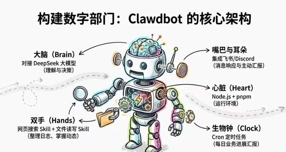 OpenClaw的核心是接入一个大模型(比如Claude、GPT-4、DeepSeek等)。但它不仅仅是调用模型聊天,而是通过系统提示词(System Prompt) 给它一个“身份设定”。比如你可以设定:“你是我的CTO,负责代码审查和部署。你需要主动检查代码质量,发现潜在bug时自动修复。”
