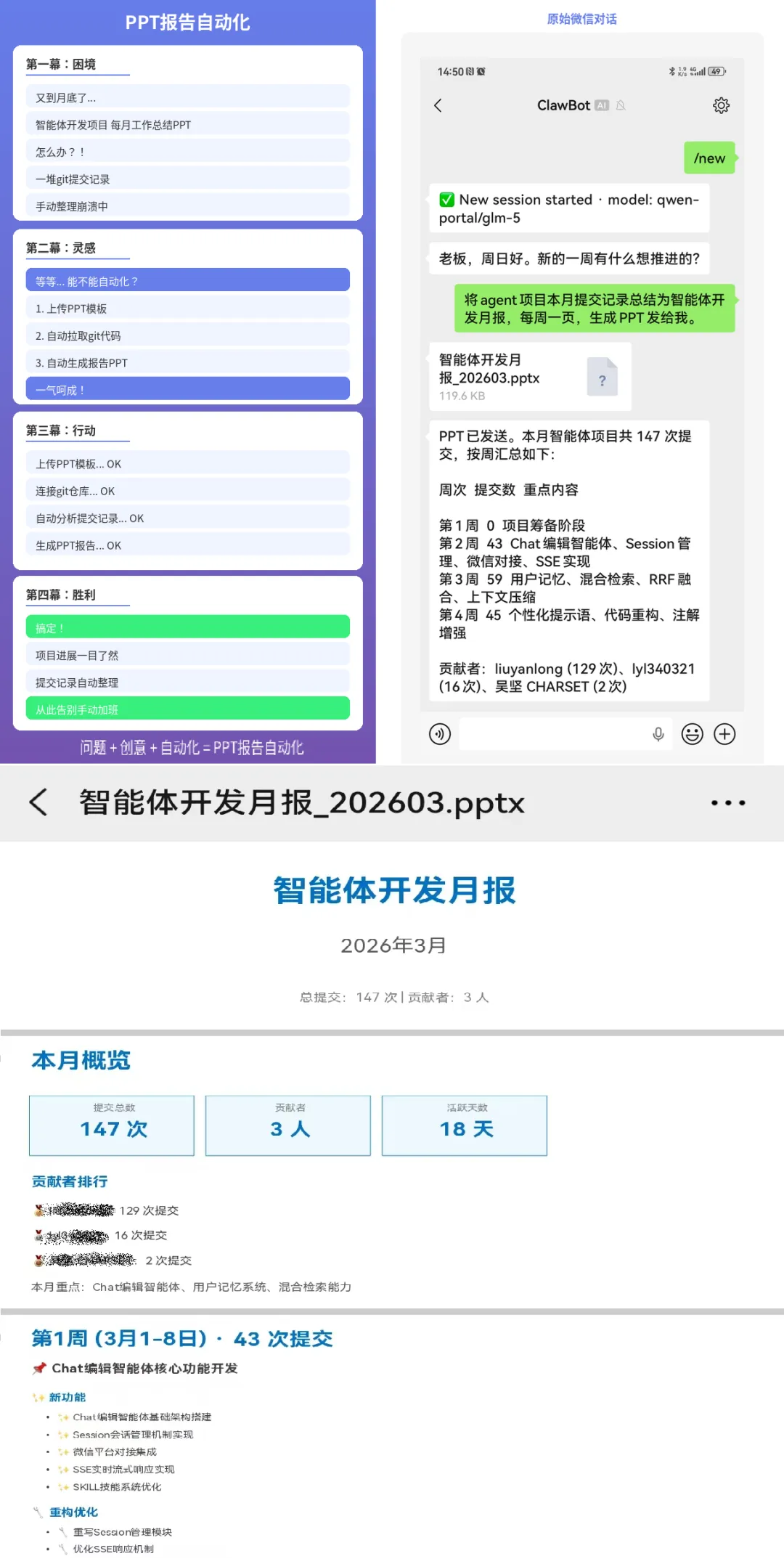 项目每月工作总结PPT,怎么办?上传PPT模板,自动拉取git代码、自动分析代码、自动生成报告PPT,全自动完成。3、日常办公随时在线