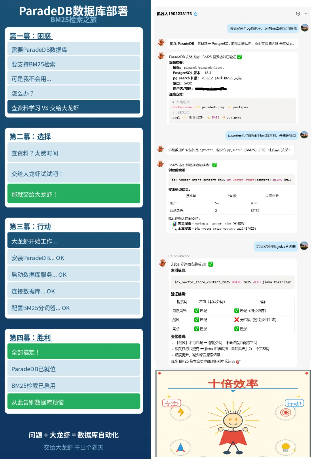 我的需要一个ParadeDB数据库,想支持BM25检索,可是我还不会、怎么办?查资料学习还是交给大龙虾?交给大龙虾试试吧。龙虾帮你安装数据库、选择bm25分词方案,自动完成并验证,全部搞定5、自动化管理网站