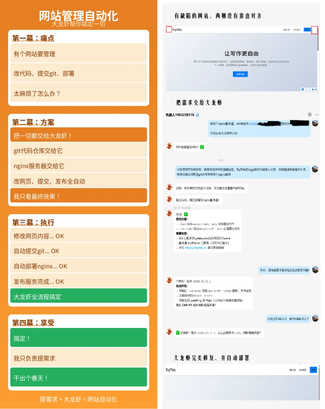 我的一个网站,大龙虾帮我管理,git代码交给他、nginx服务器交给他,帮你改网页、帮你提交代码库、帮你发布服务。你只要提需求、看最终效果。6、识别并解决代码冲突
