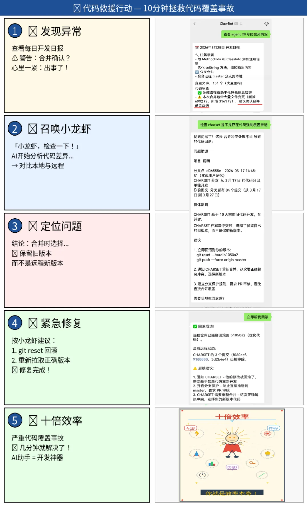 在我查看每日开发日报时,龙虾给出请“确认合并是否正确”的警告,于是让小龙虾继续检查、得出结论“用户在合并时选择保留的自己的旧版本,而不是远程的新版本”,接着按照小龙虾的建议回滚,大龙虾帮你解决冲突、修复完成。思想是效率的源泉