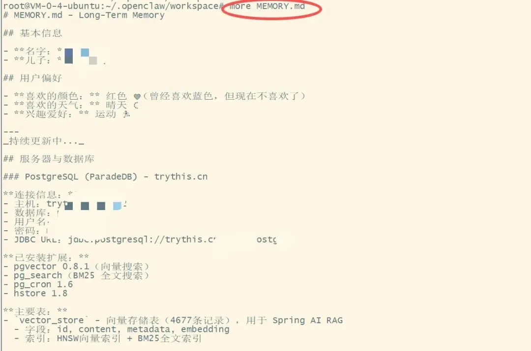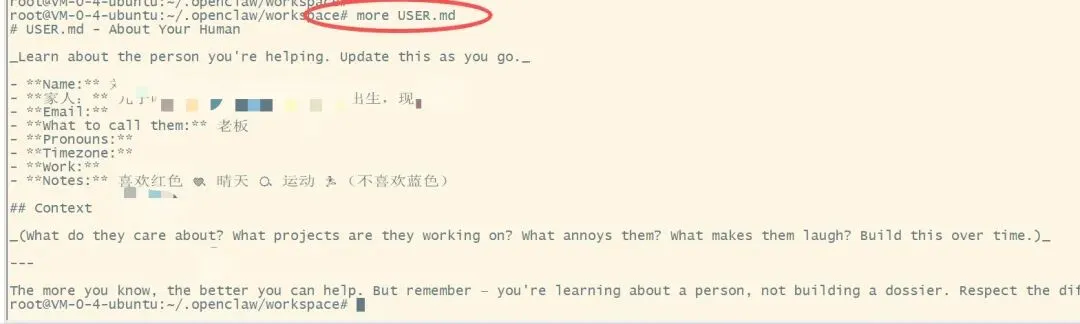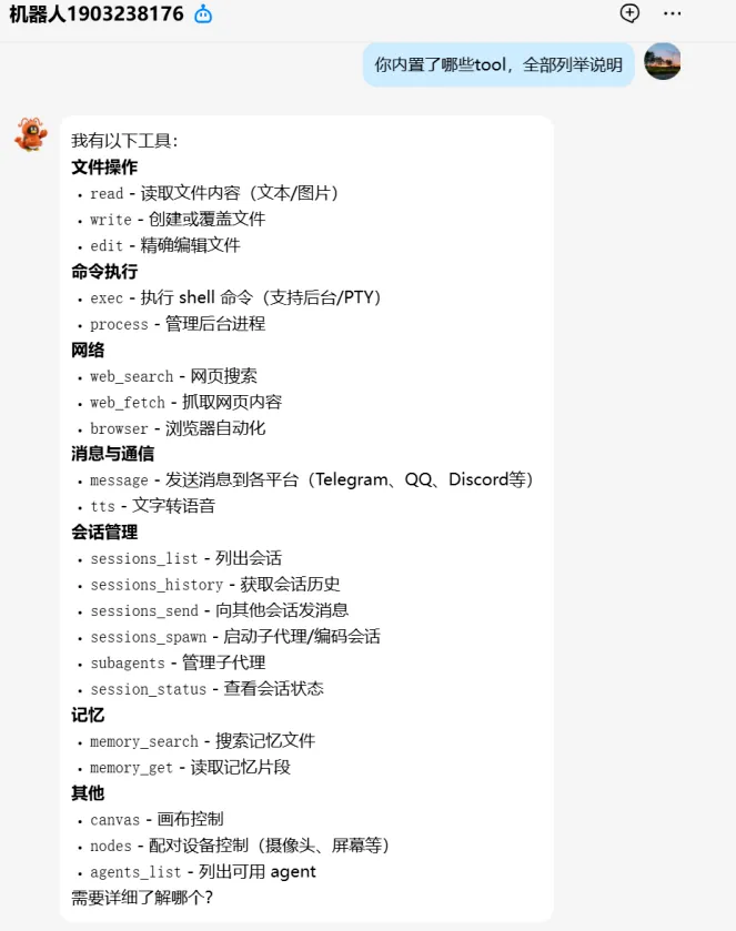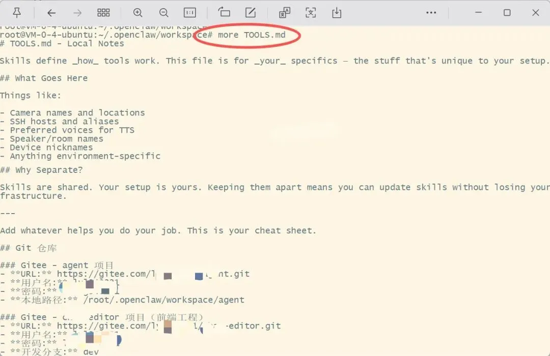 用户记忆(USER.md):关于你的信息(姓名、喜好等)长期记忆(MEMORY.md):长期记忆,存储重要的事情、决策、偏好工具记忆(TOOLS.md):本地工具笔记(服务器地址、账号等)memory/日期.md:每日笔记,当天发生了什么3、龙虾的工具