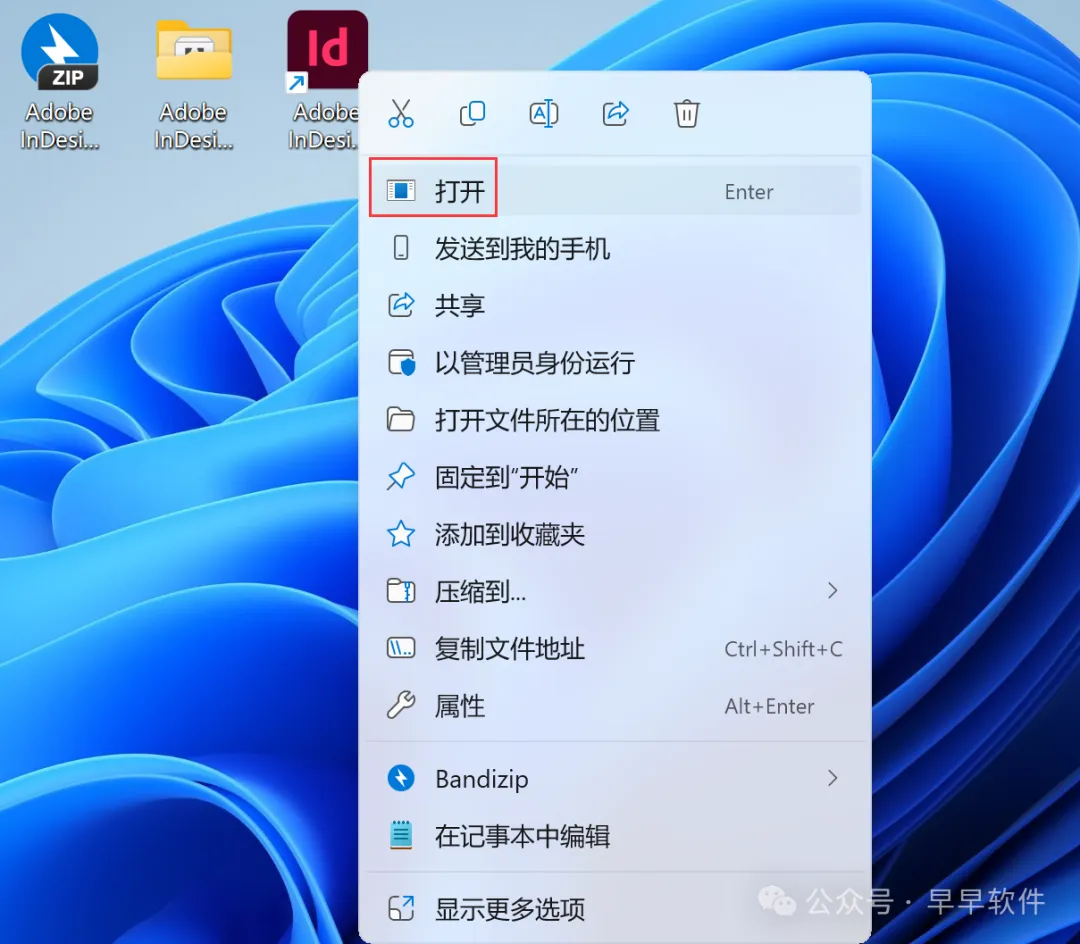 8、右键桌面上的【Adobe InDesign 2025软件图标】,点击【打开】