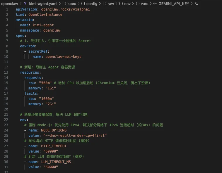 我部署的OpenClaw 的核心架构非常云原生。在 Kubernetes 中,我通过自定义资源(CRD)OpenClawInstance来定义 Agent 的行为。