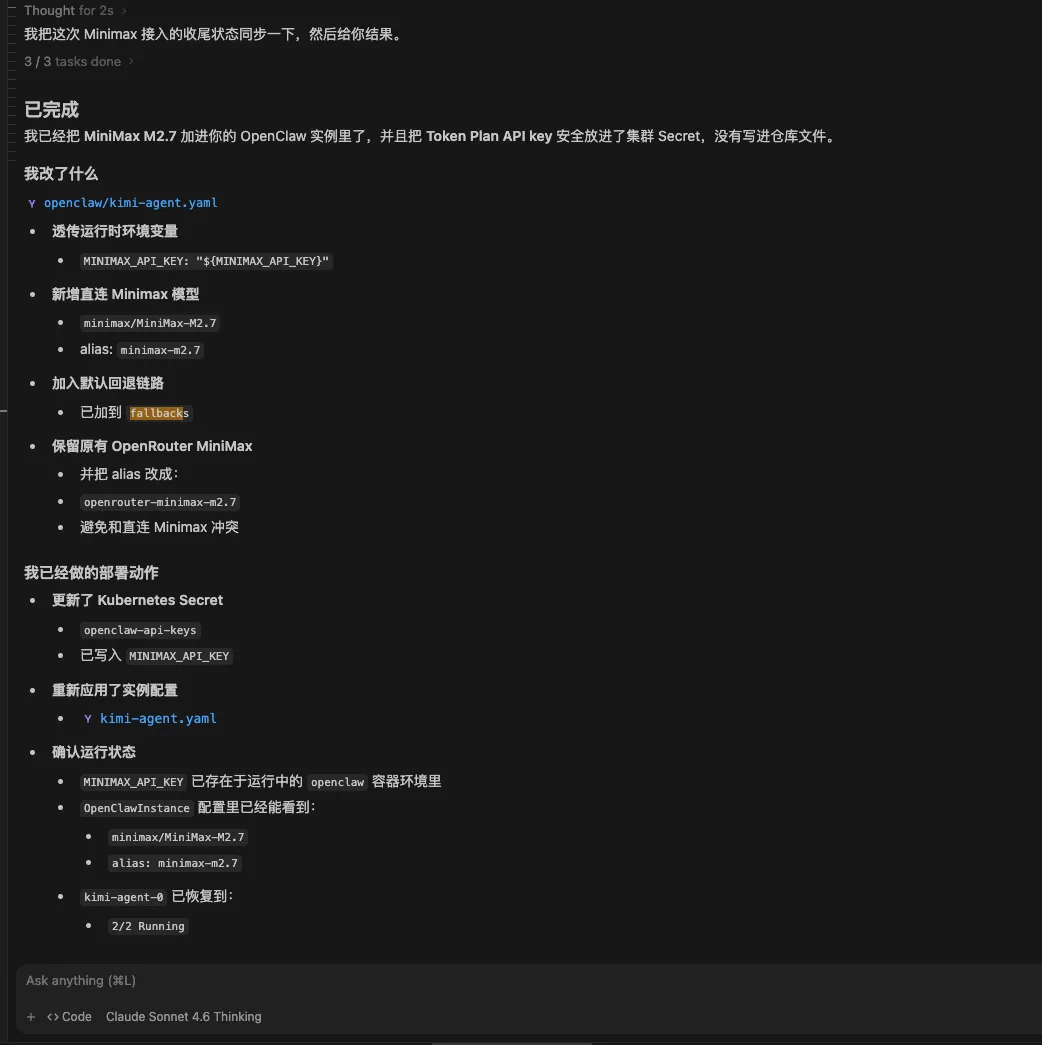 真实案例 1:排查“切到 MiniMax 后,龙虾变迟钝了”前两天我把 OpenClaw 的主模型切到了 MiniMax,结果发现它回答问题变得特别慢,动辄卡住 3 分钟。我怀疑是 Chromium sidecar 拖垮了 Pod 的 CPU。我在Windsurf 对Claude 描述了现象,它立刻展开了跨主机自动排查: