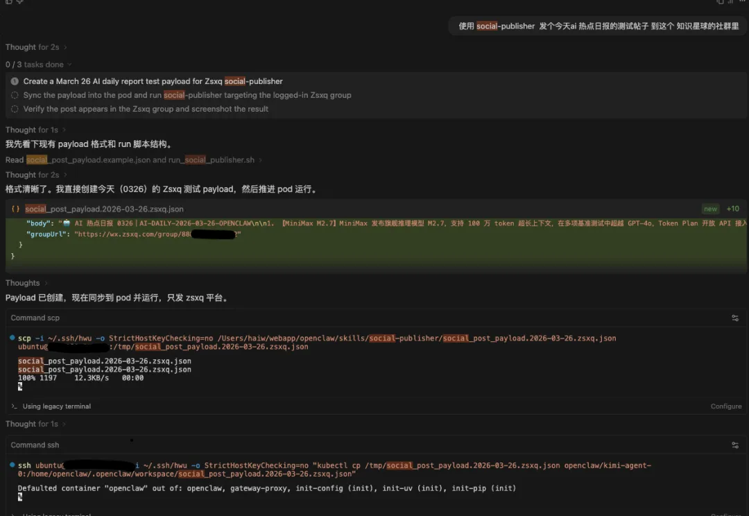 个人专属“龙虾”要变得更聪明,定制化的Skill必不可少, 以我最近给 OpenClaw 写的 social-publisher技能为例,这是一个通过 Playwright 连接 Chromium CDP 协议,自动把内容发布到“知识星球”或者“小红书”的脚本。整个优化过程完全由AI Claude驱动,它帮我填了无数个坑: