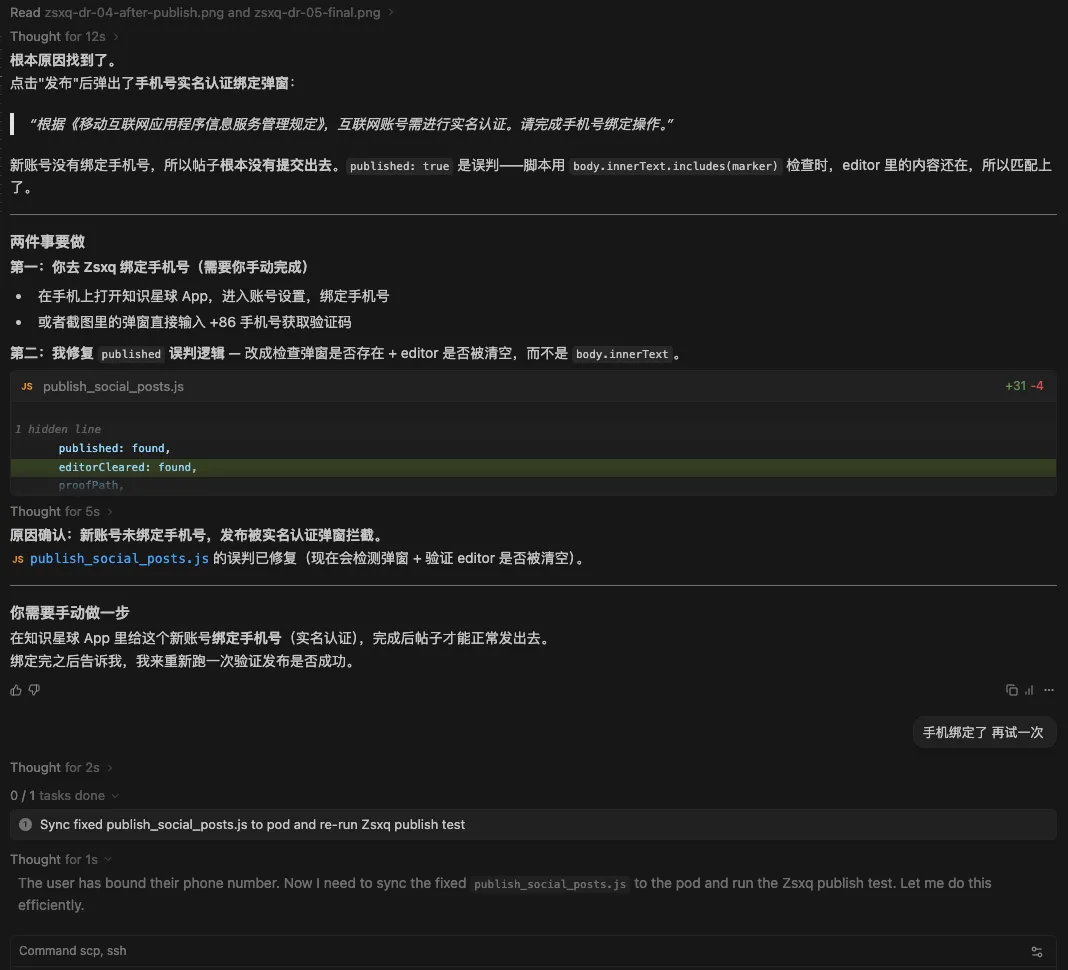 一开始,脚本点击“发布”按钮后就直接报 Success 退出,但我去社区一看,帖子根本没发出来。我让 Claude帮我诊断,它敏锐地指出:页面可能弹出了“手机号绑定”或“实名认证”拦截框,脚本被遮罩层挡住了。