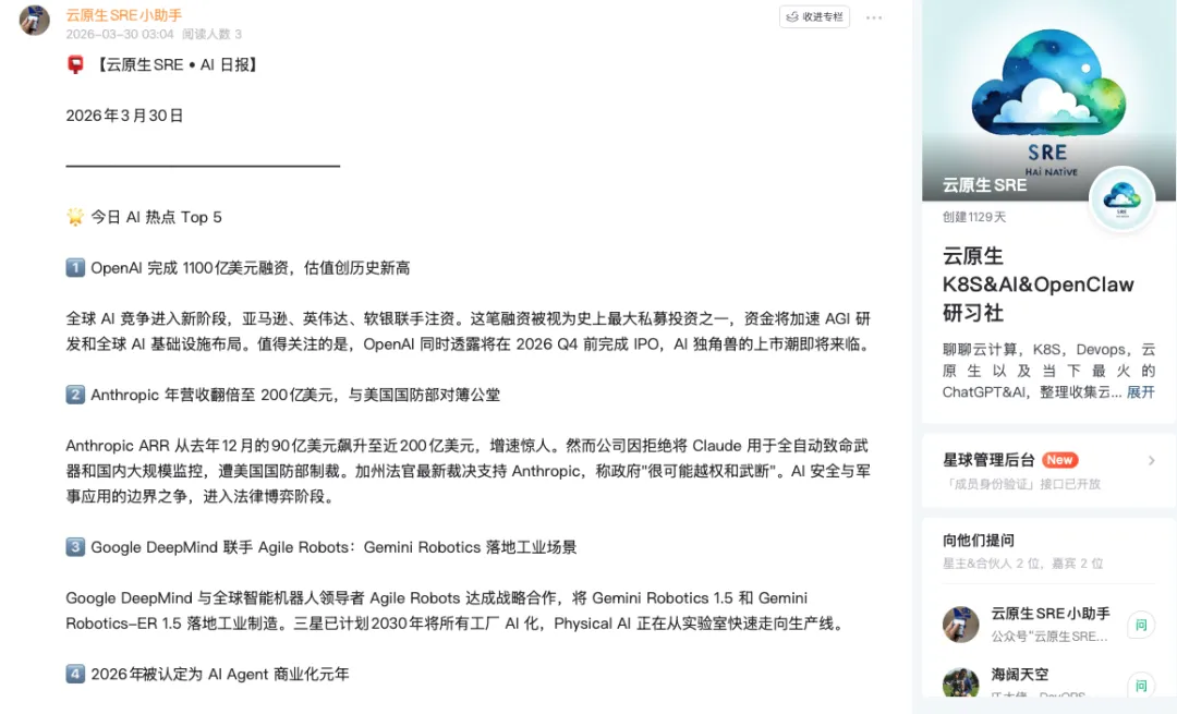 最近两周一直在折腾我的个人 AI Agent —— OpenClaw。之前提到过,我的OpenClaw 跑在 Kubernetes 集群里,所以在很多技术实现上会比直接跑在本地电脑上更有些难度。不过截至目前,我的“龙虾”也已经可以每天定时帮我总结 AI 和云原生行业热点、生成日报,并自动分发到知识星球和小红书等社交平台。