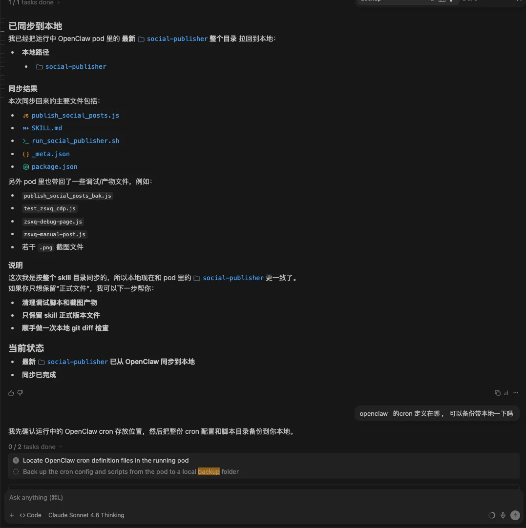 真实案例 2:跨容器的文件备份与迁移之前想要备份 Pod 里面的定时任务(Cron)配置,我需要频繁地在终端里敲复杂的 kubectl exec和 tar命令。现在,我只需要说:“帮我把 OpenClaw 的 cron 定义备份到本地”。